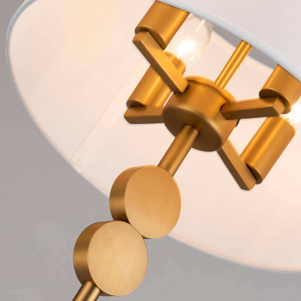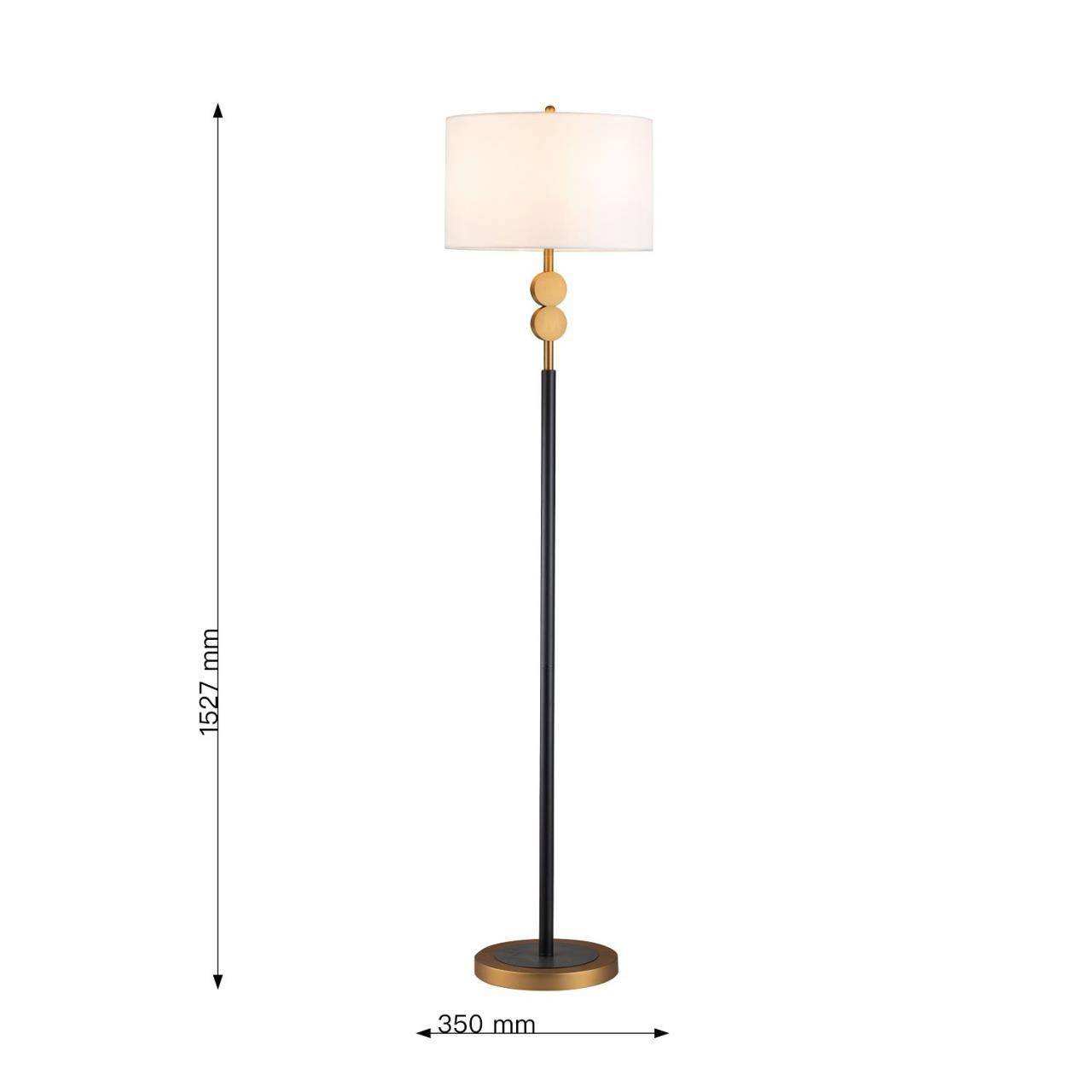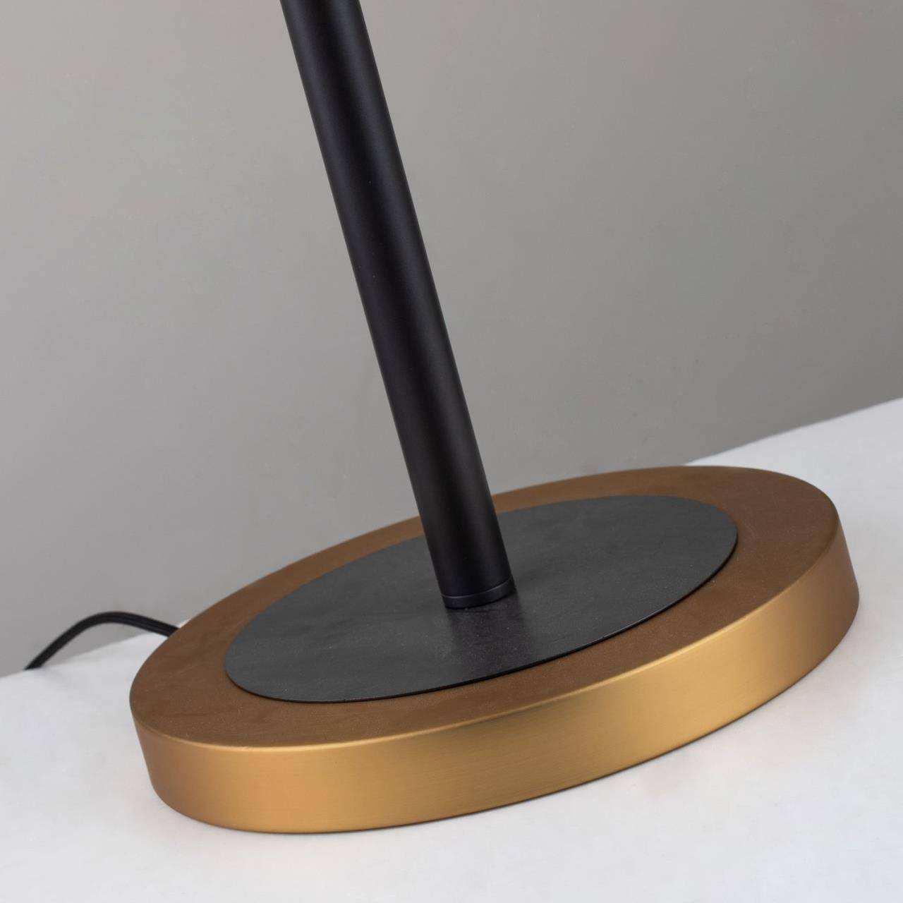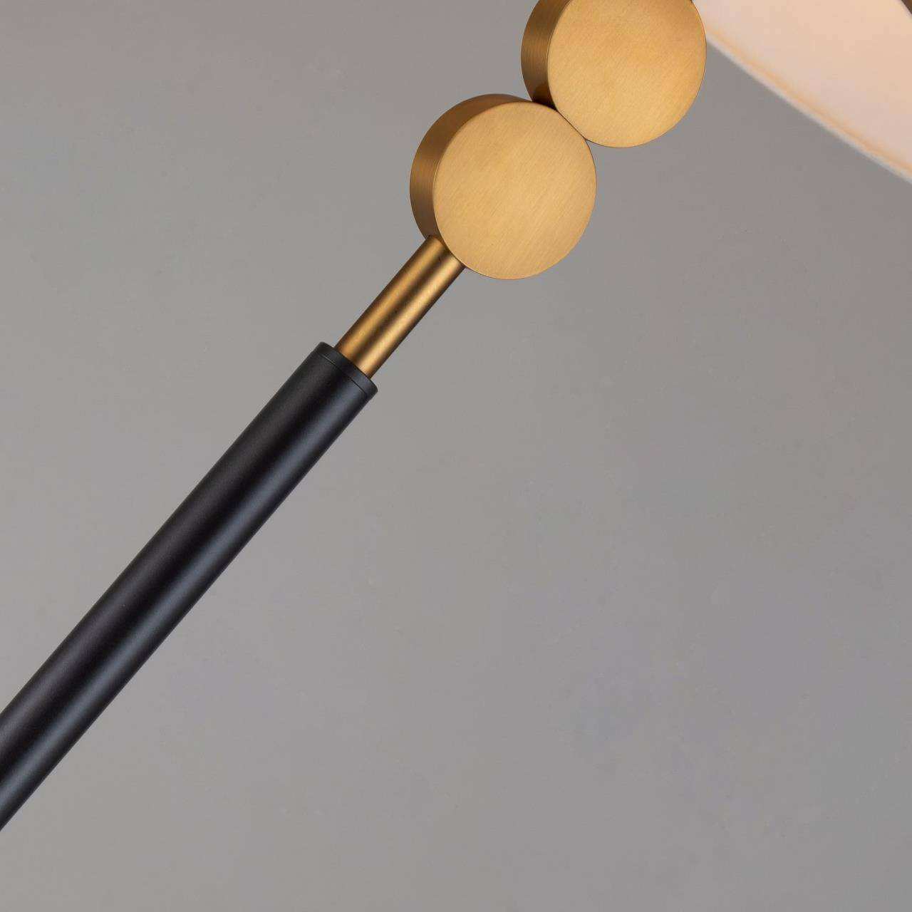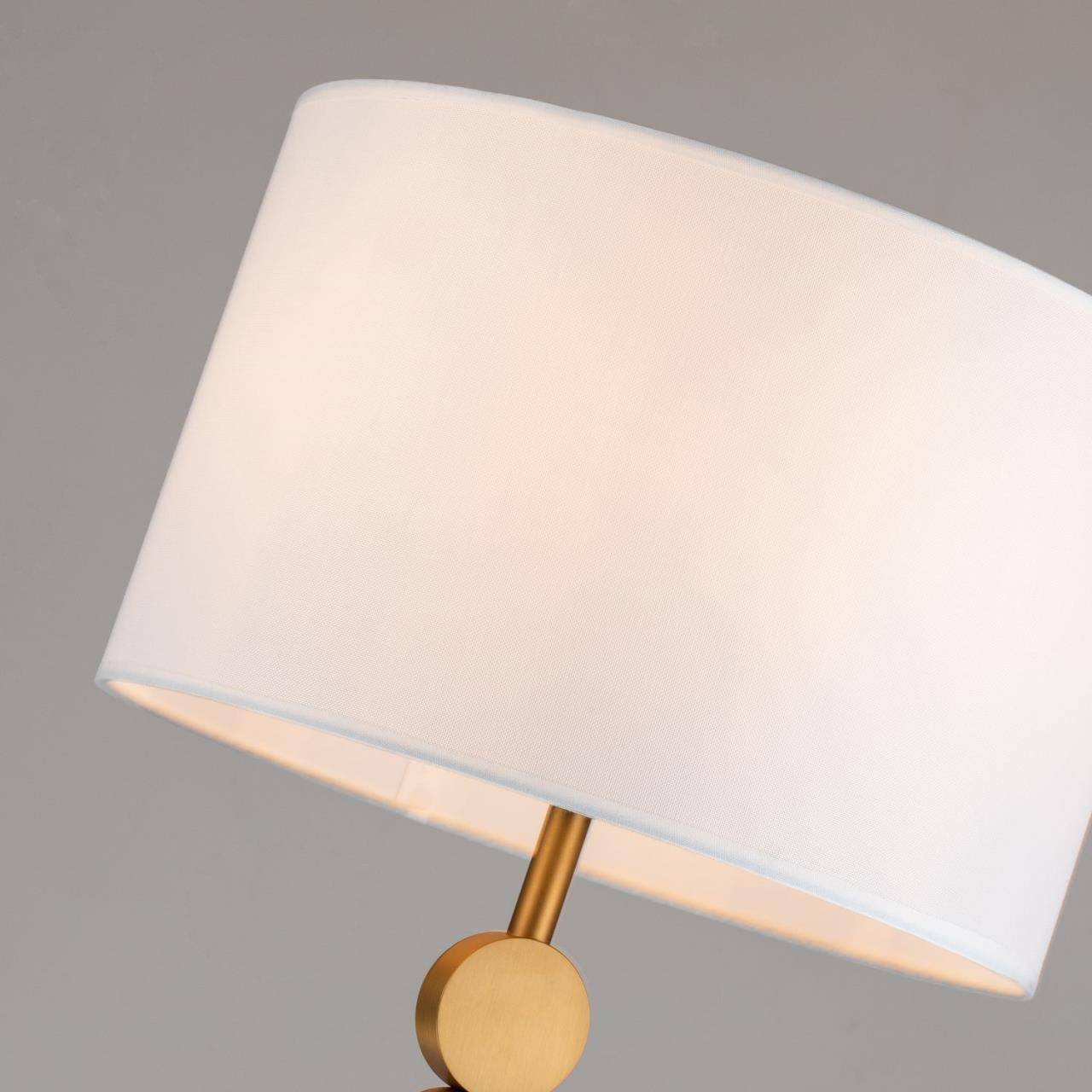 Черный каркас с коричневым основанием, плафон из белой ткани, латунный декоративный элемент в виде двух кругов