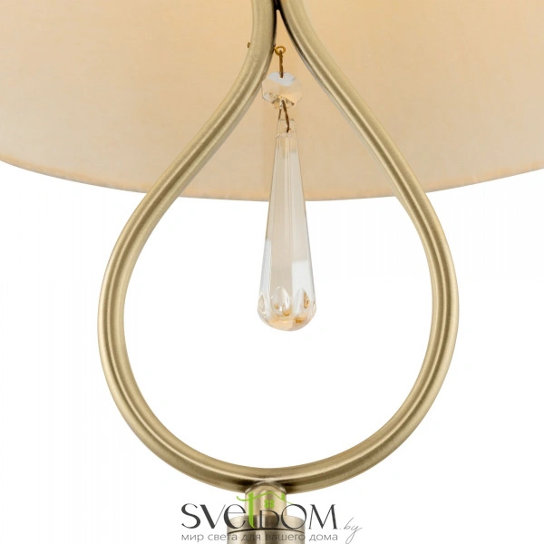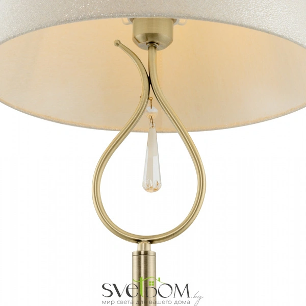 Металлическая арматура. Цвет – латунь. Абажуры из фактурной ткани белого цвета. Декор – хрустальные подвесы каплевидной формы. Одиночный подвес и торшер с цоколем Е27, лампа, бра и люстры – Е14.