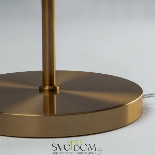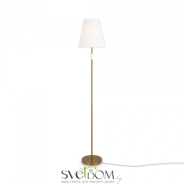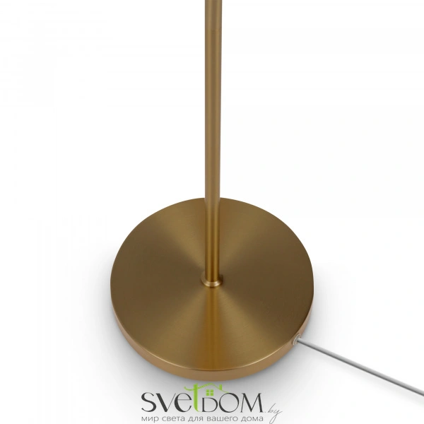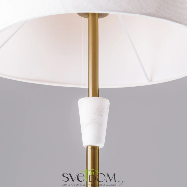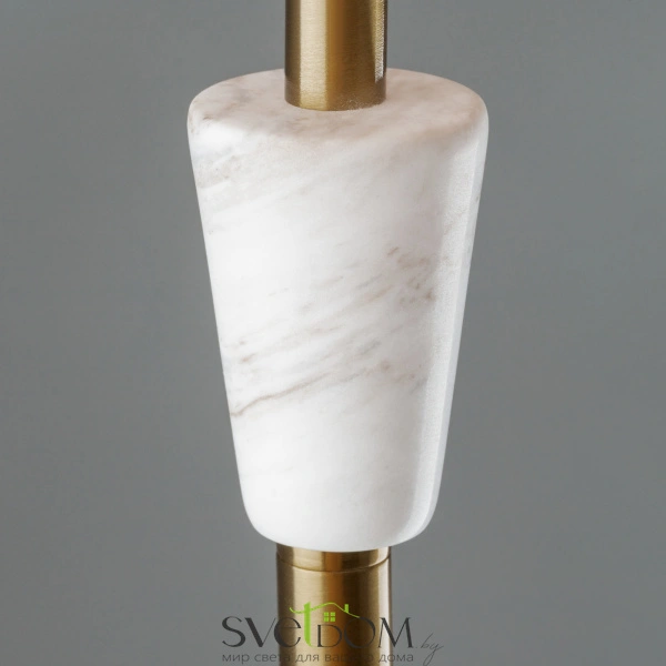 Металлическая арматура в цвете латунь. Дополнительные элементы — минималистичные вставки из натурального белого мрамора. Белые абажуры из ткани в форме конуса. Источник света — лампа с цоколем Е14 или Е27.