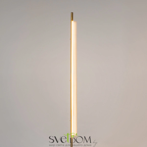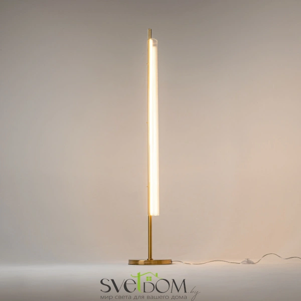 Арматура из металла, цвет - латунь с сатиновым финишем. Плафон из рифленого прозрачного стекла. LED-источник света. Теплая цветовая температура 3000К. Регулируемый по длине провод 3 метра у подвесного светильника. Подходит для помещений с высокими потолками. Торшер с push-кнопкой на проводе для удобного включения и выключения.