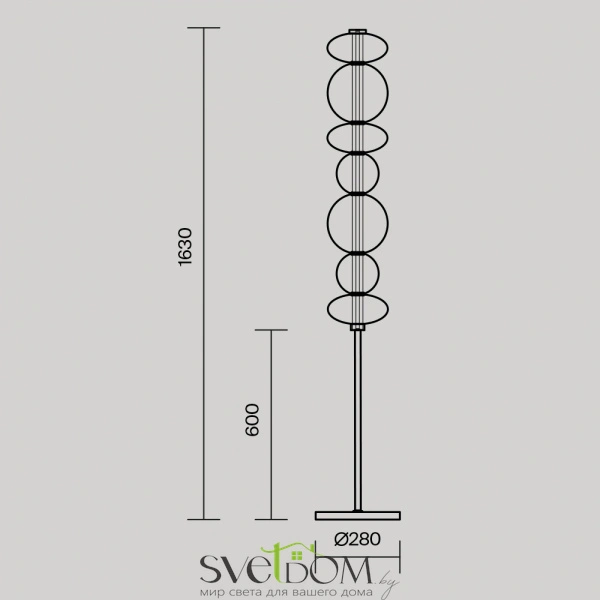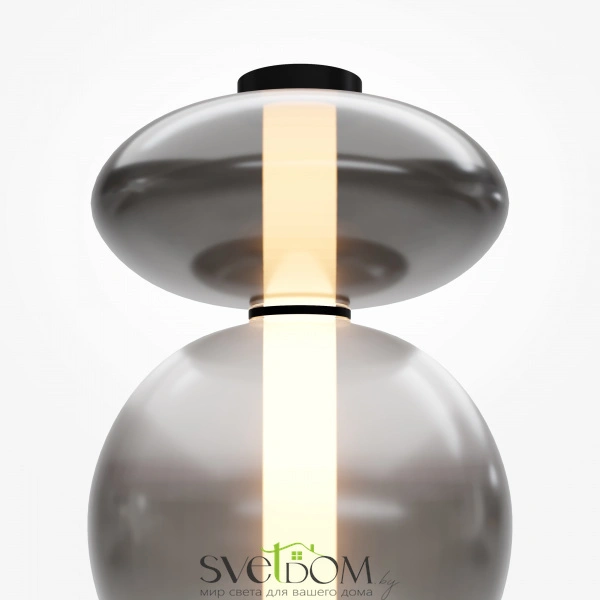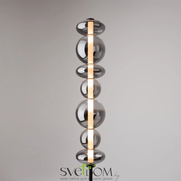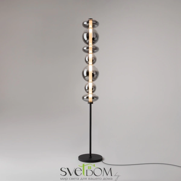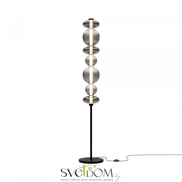 Светильники с тонированными выдувными стеклянными плафонами (дымчатыми  или янтарными) и металлической арматурой (черной или цвета латуни). Окрашивание плафонов градиентное. Источник света: LED. Световой элемент установлен внутри акрилового рассеивателя. Цветовая температура источника света – 3000К, угол рассеивания — 120°. Торшеры снабжены Push-кнопкой на проводе.
