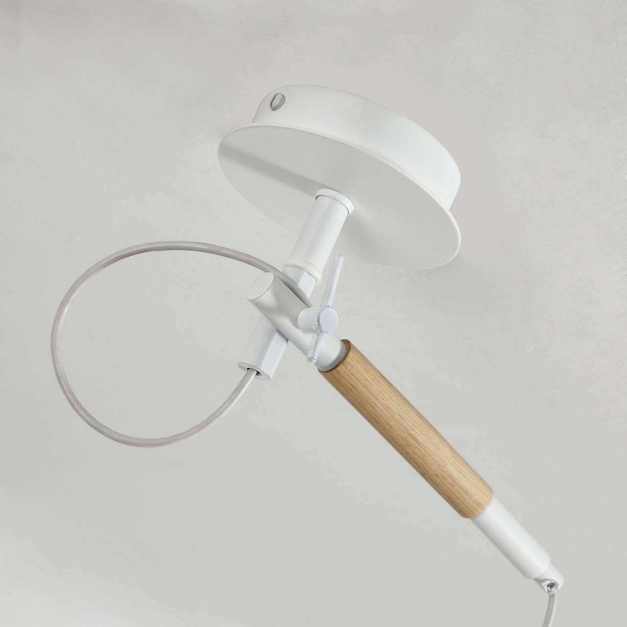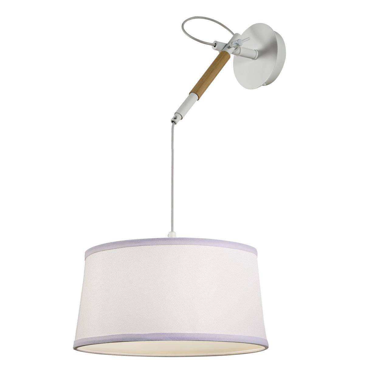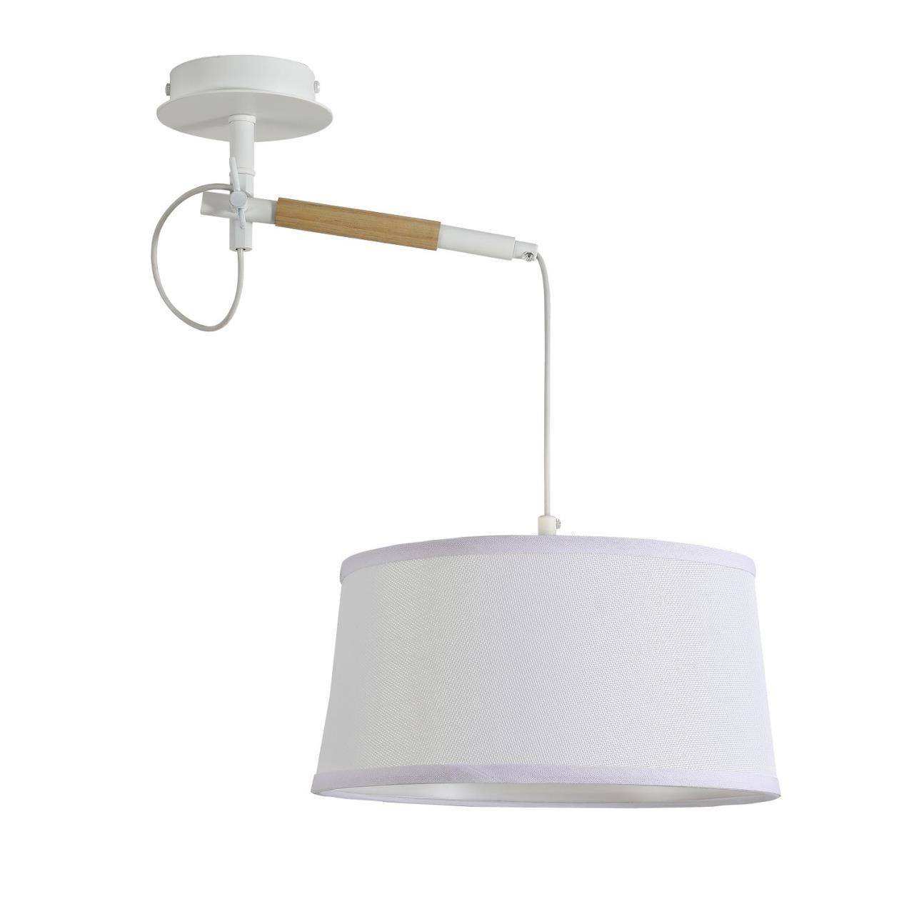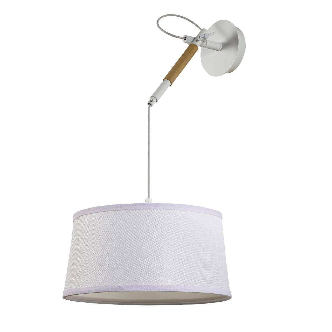 Каркас белого цвета со вставкой под цвет дерева, плафон из кремовой ткани, светильник можно монтировать как на потолок, так и на стену