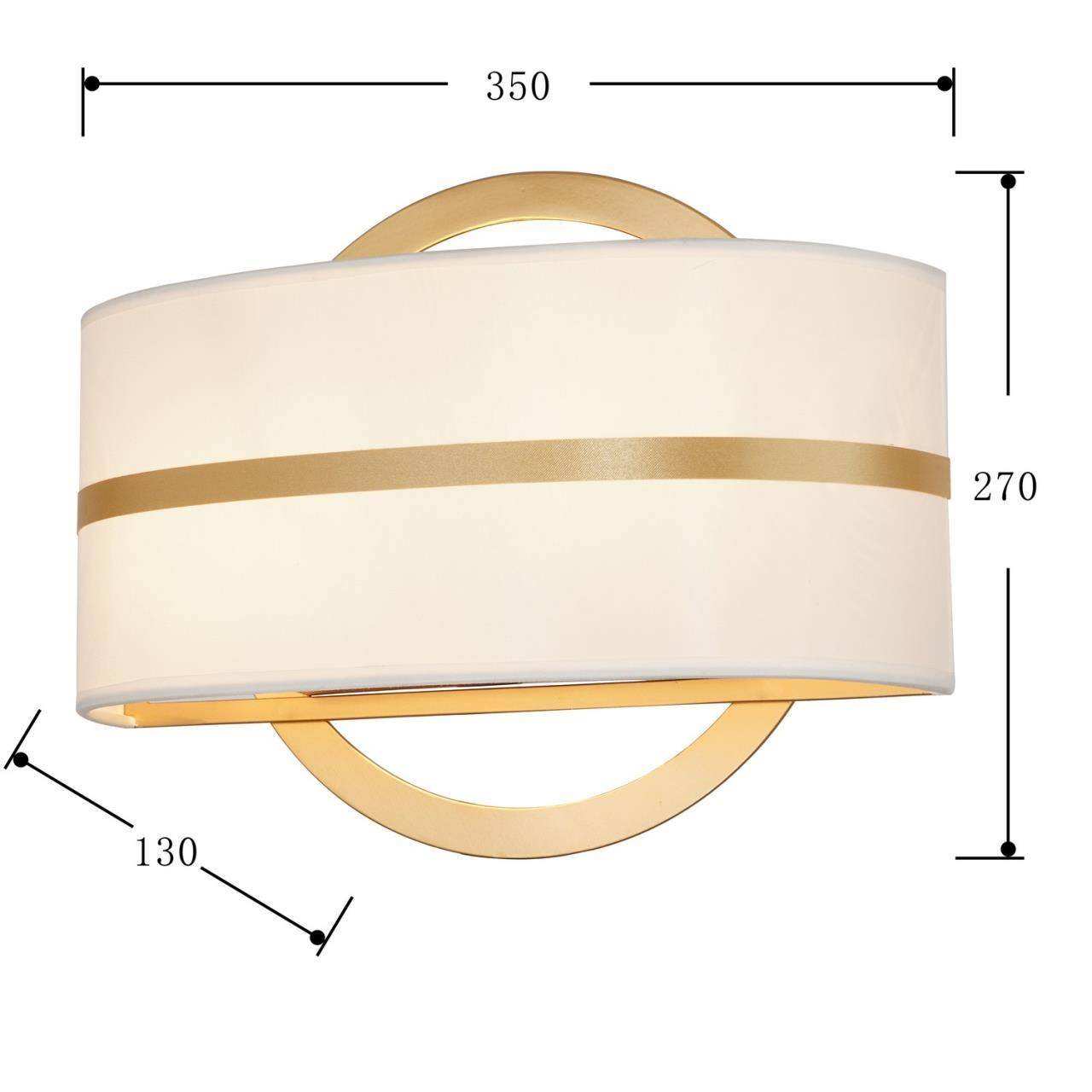 Каркас золотого цвета, абажур из белой ткани с золотистыми лентами