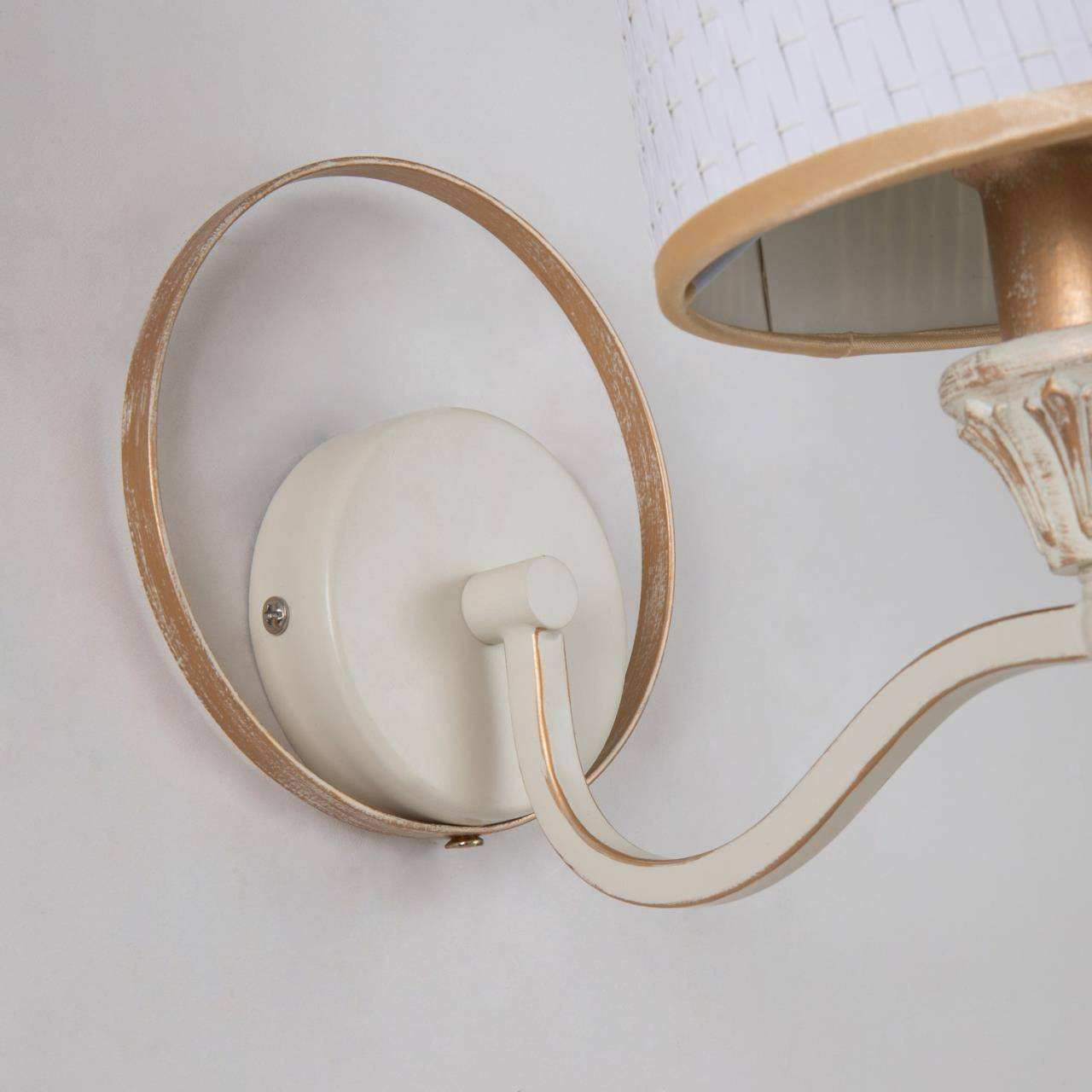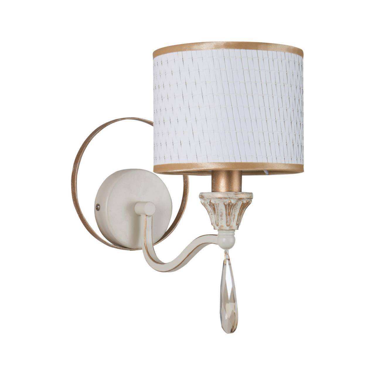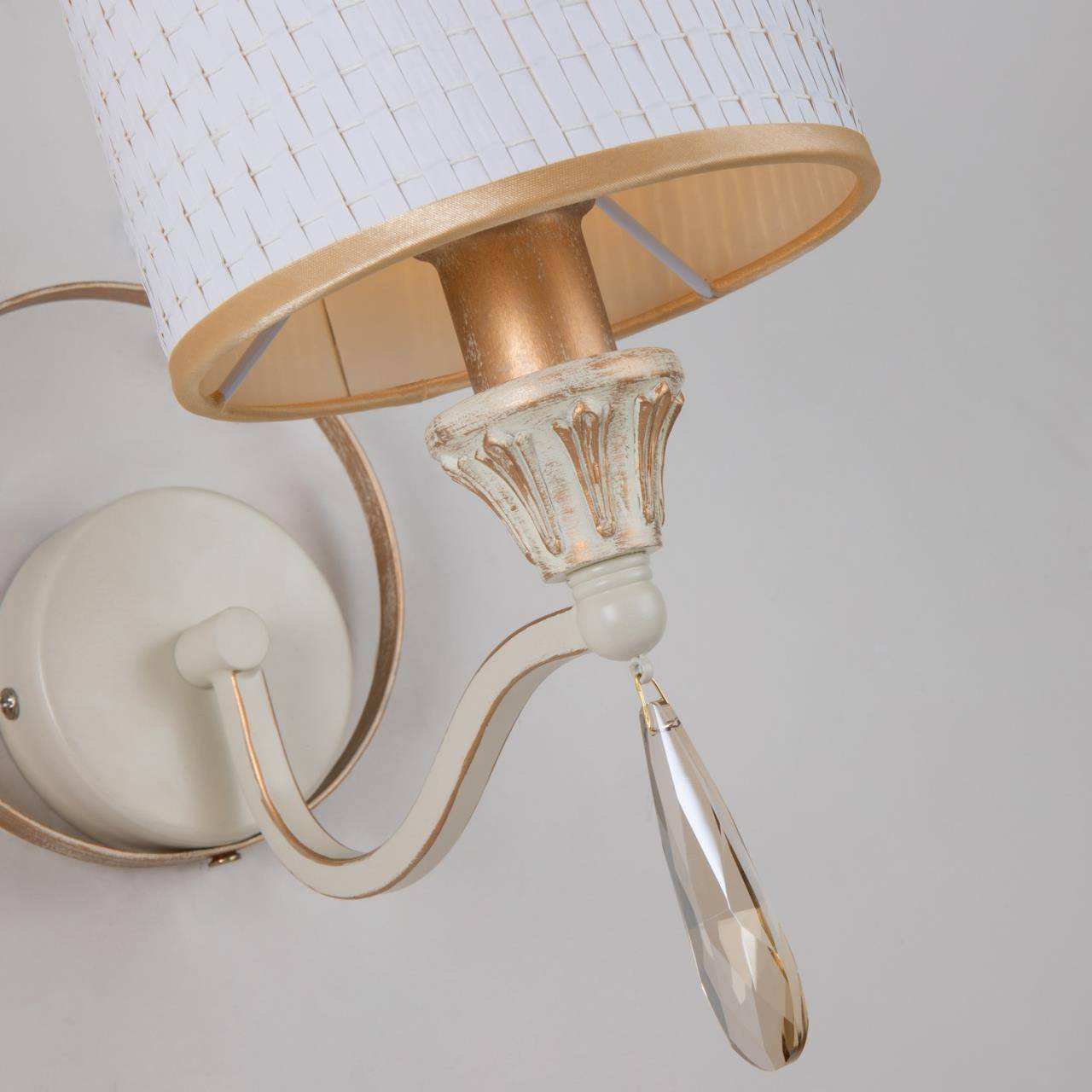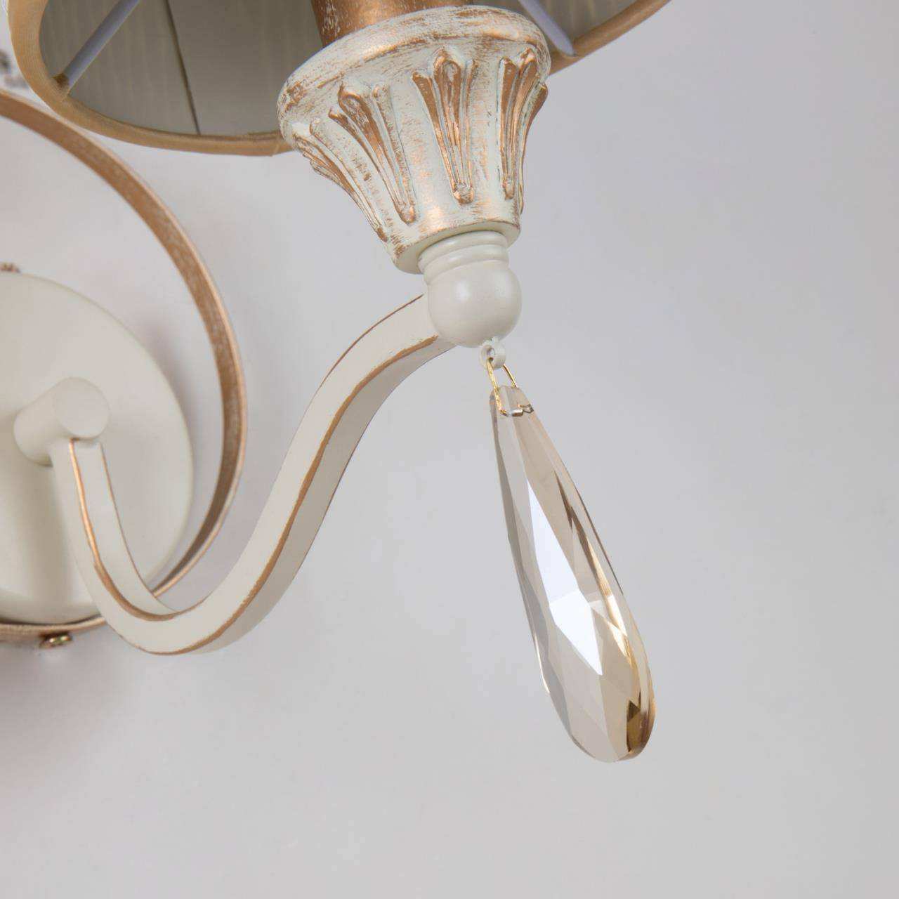 каркас белого цвета с патиной цвета перламутровое золото, абажуры из белой ткани с золотой тесьмой, декоративные элементы из прозрачного хрусталя