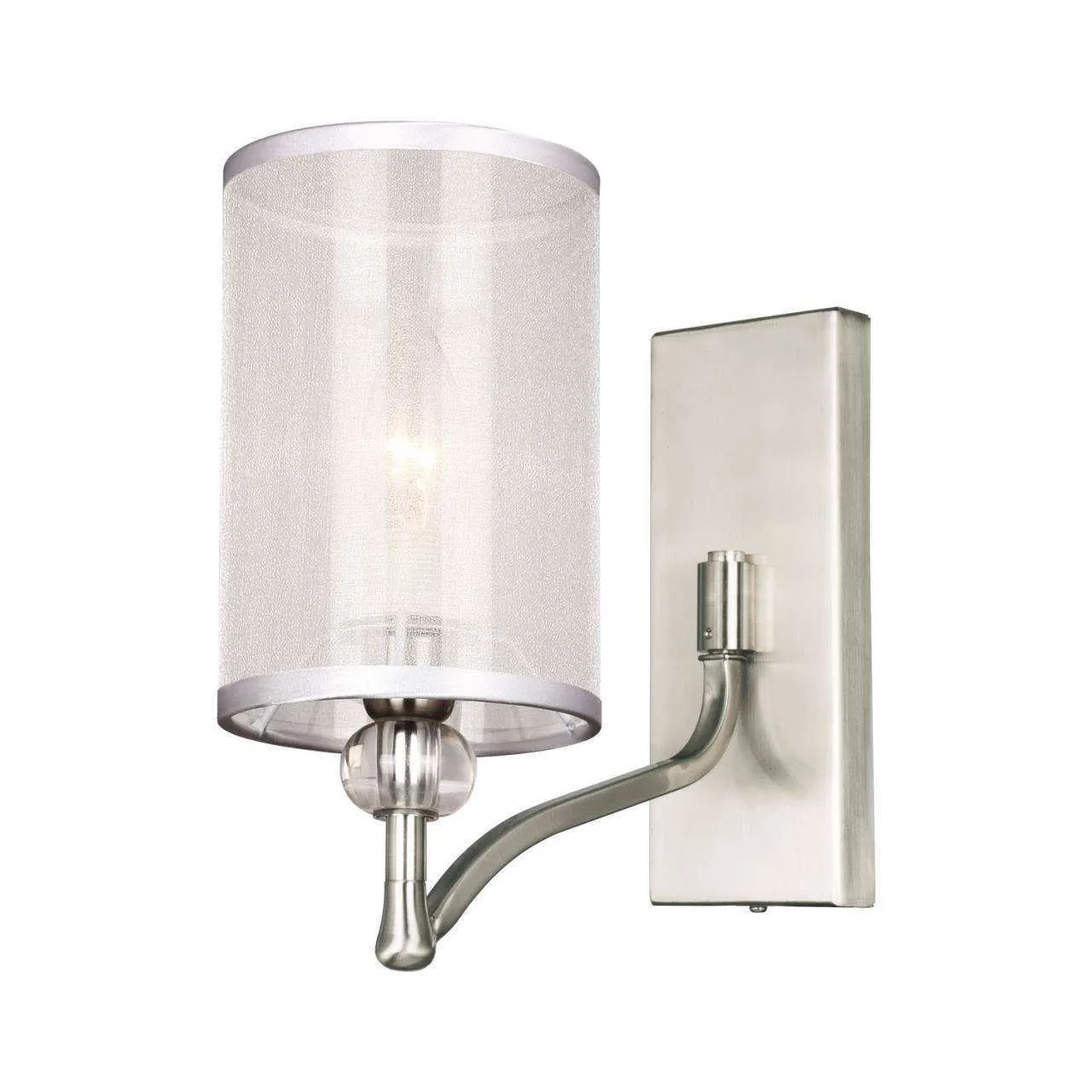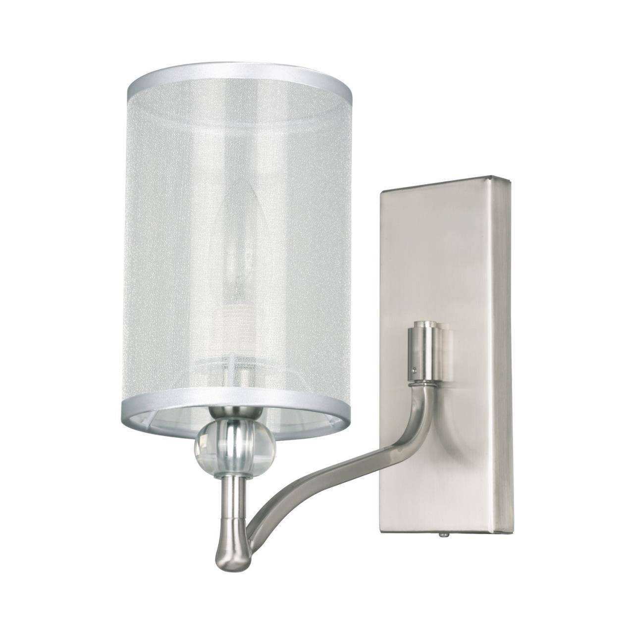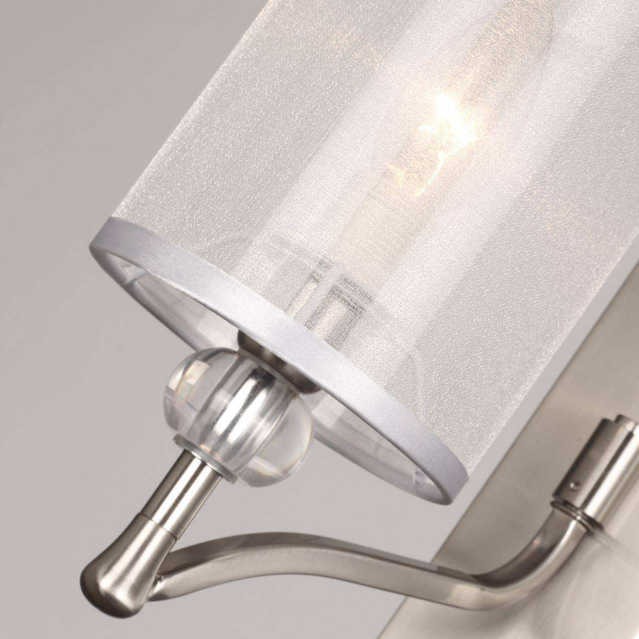 каркас цвета никель, абажуры из органзы белого цвета, декоративные элементы из прозрачного стекла, бра можно монтировать как плафонами вверх, так и пл