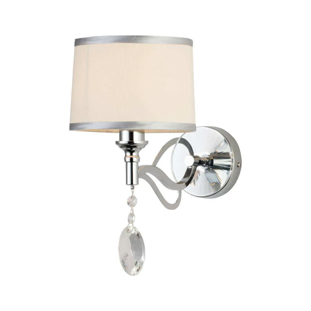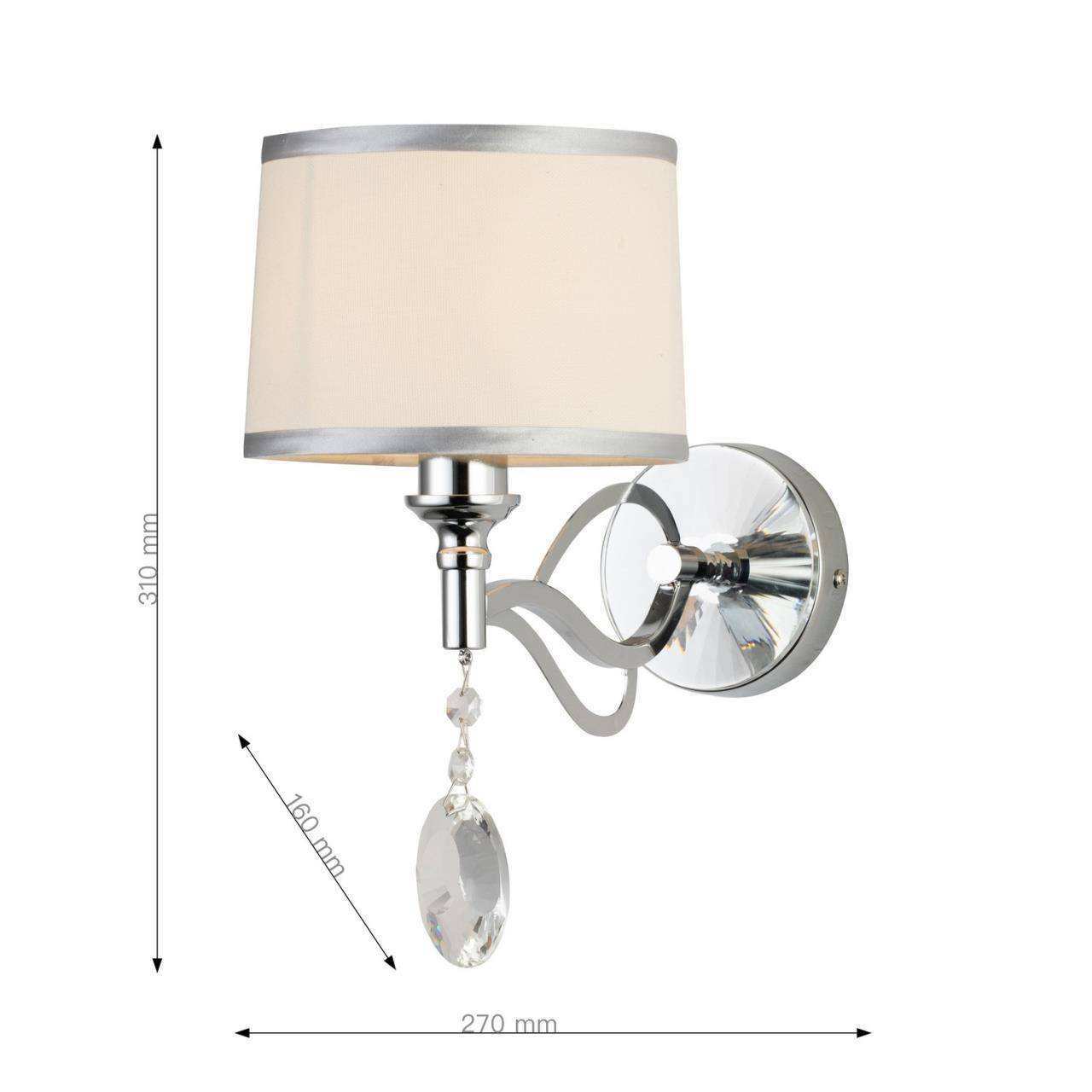 Каркас цвета хром, абажур из белой ткани с серебряной тесьмой, декоративные элементы из прозрачного хрусталя
