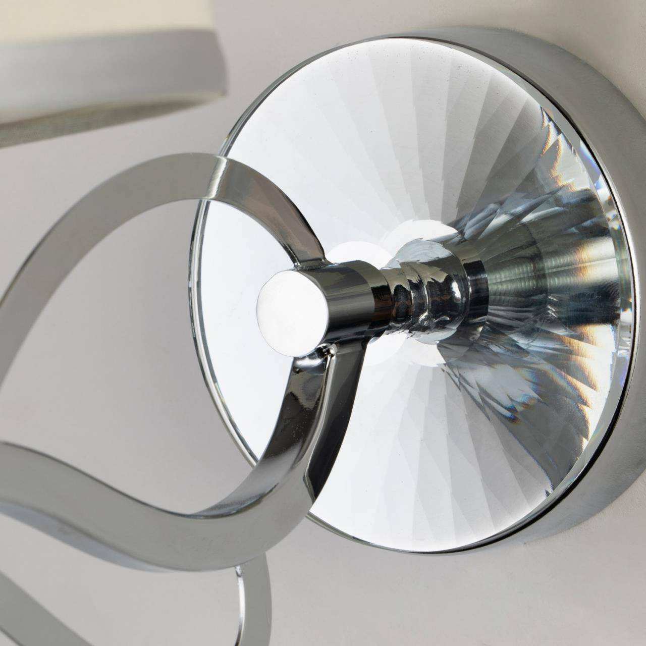 каркас цвета хром, абажур из белой ткани с серебряной тесьмой, декоративные элементы из прозрачного хрусталя