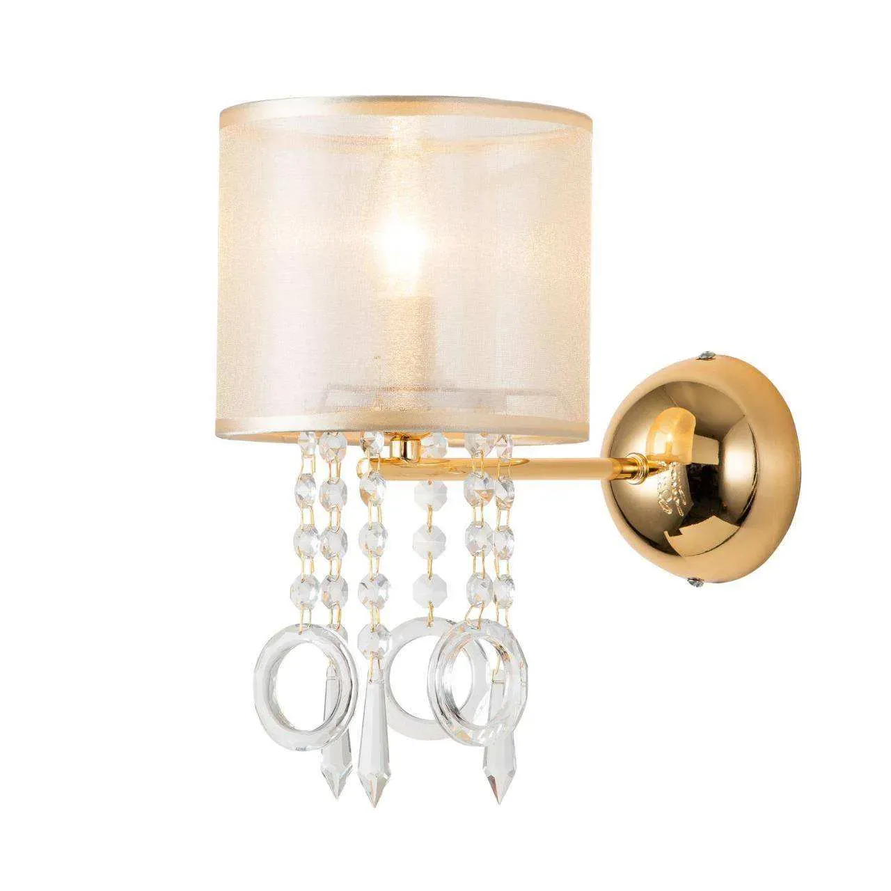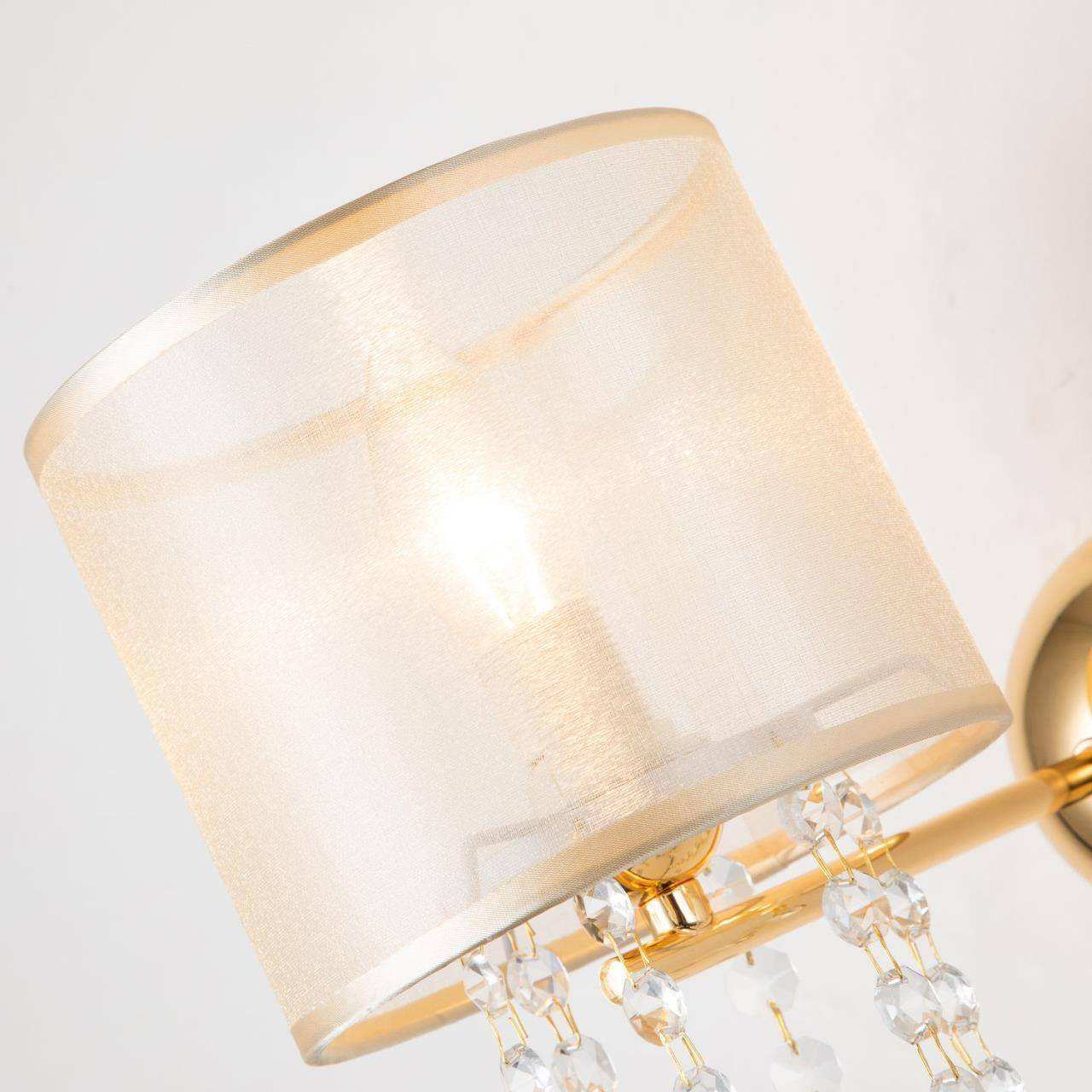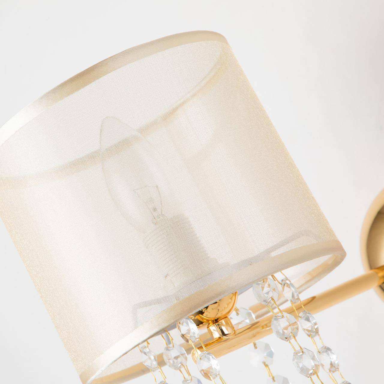 Каркас золотого цвета, плафон из органзы янтарного цвета, декоративные элементы из стекла и хрусталя