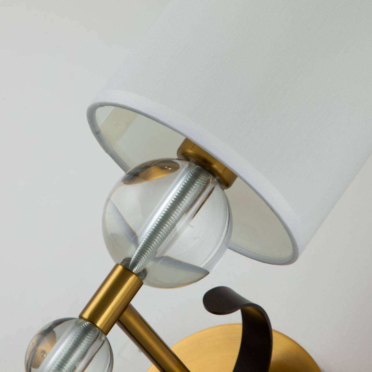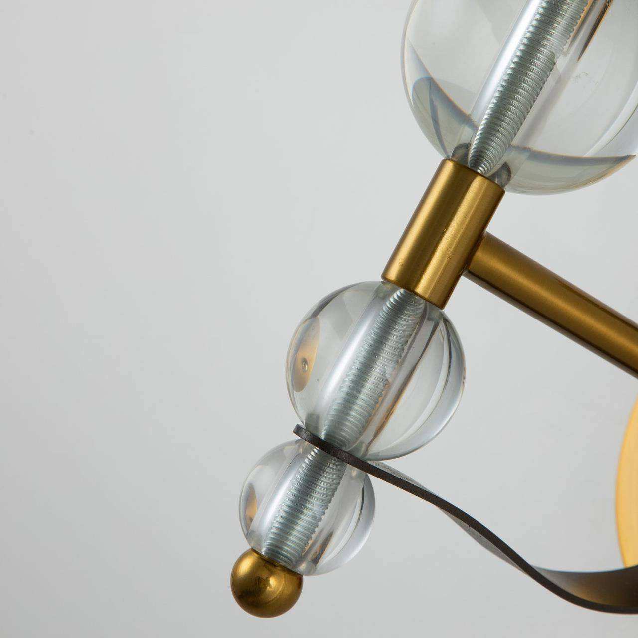 каркас цвета латуни, декоративные металлические ленты темно-коричневого цвета, декоративные стеклянные шары на рожках, плафоны из ткани белого цвета