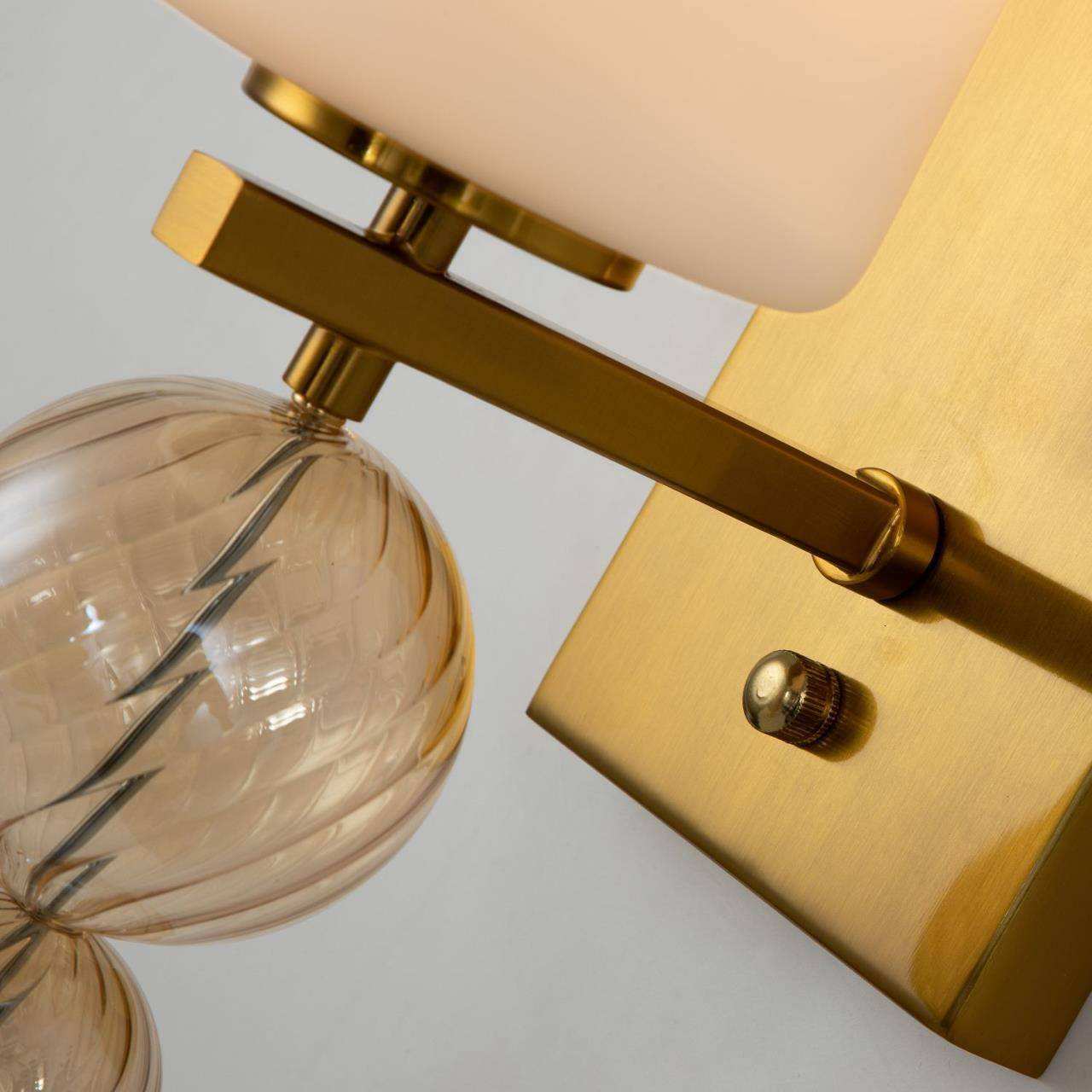 Каркас цвета латуни, декор в виде узорных выдувных стеклянных шаров янтарного цвета, плафон из стекла белого цвета