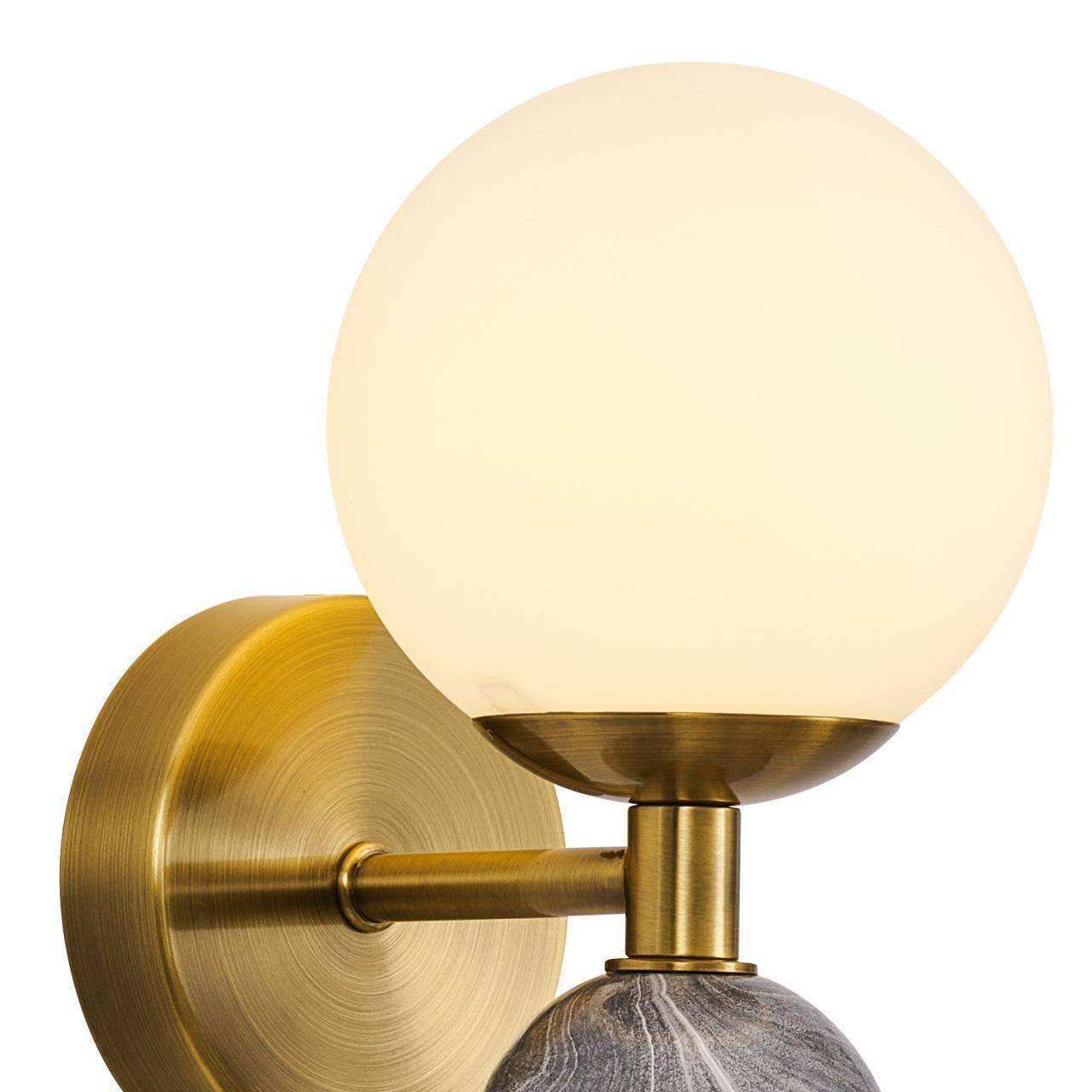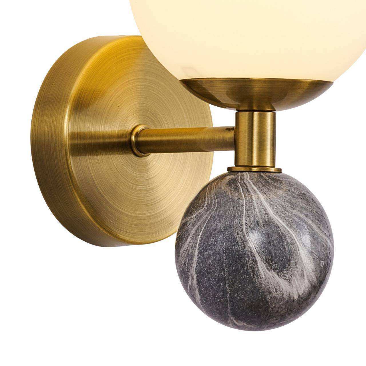 каркас цвета латуни, плафон шарообразной формы из матового белого стекла, декоративный элемент из керамики цвета черного мрамора, лампу G9 можно менят