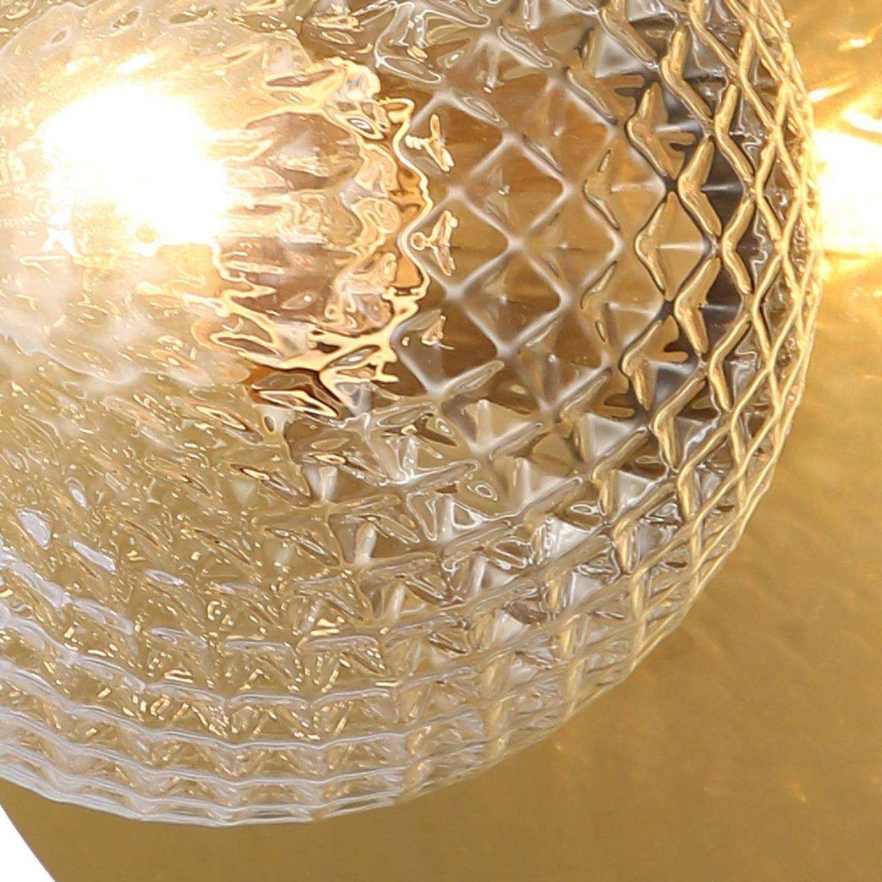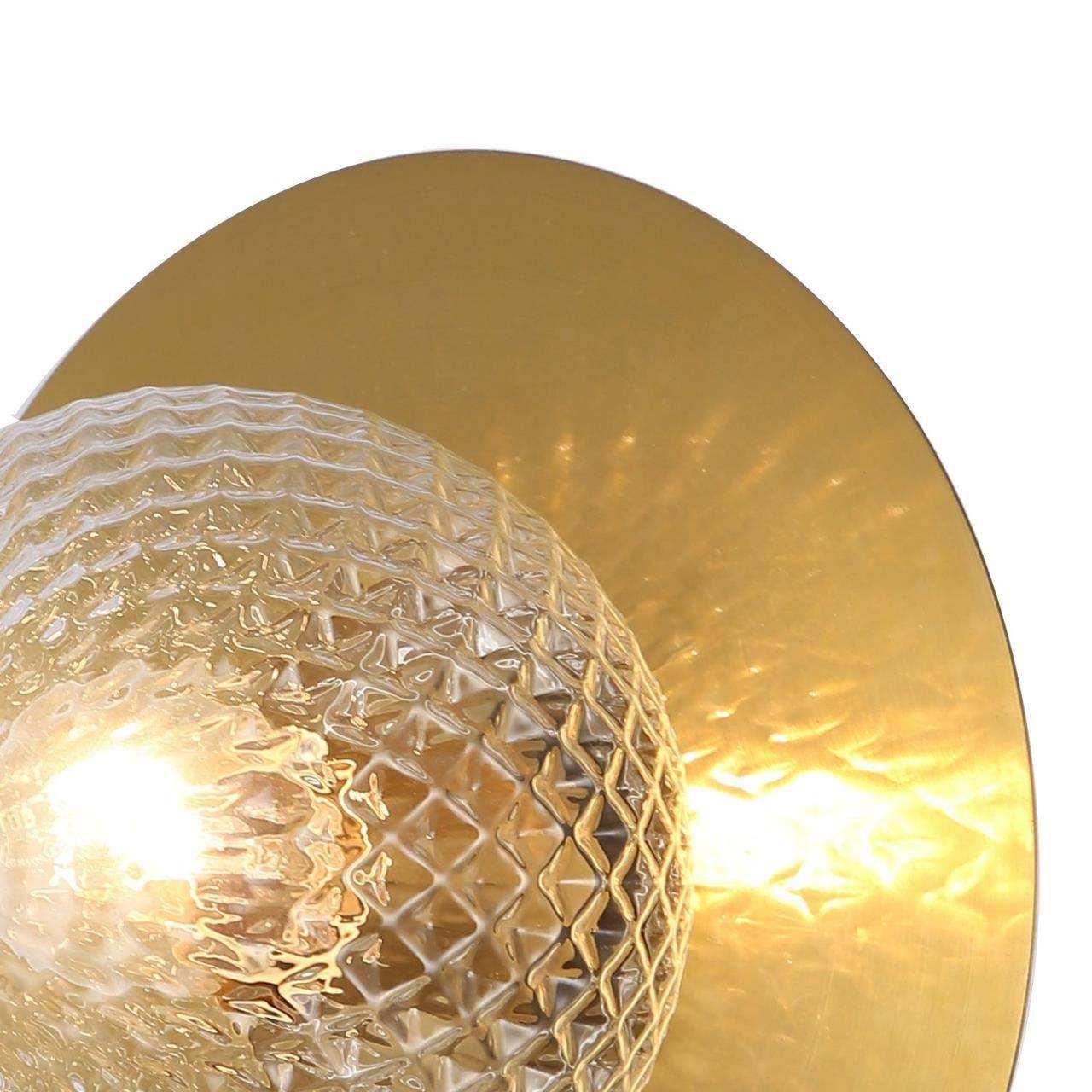Каркас цвета меди, плафон из прозрачного узорного стекла, декоративный элемент в виде металлического блюдца