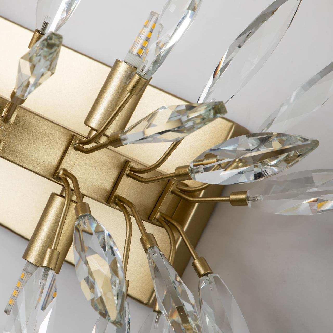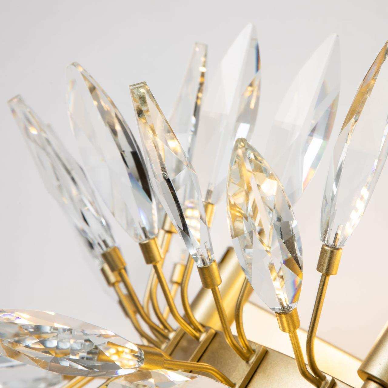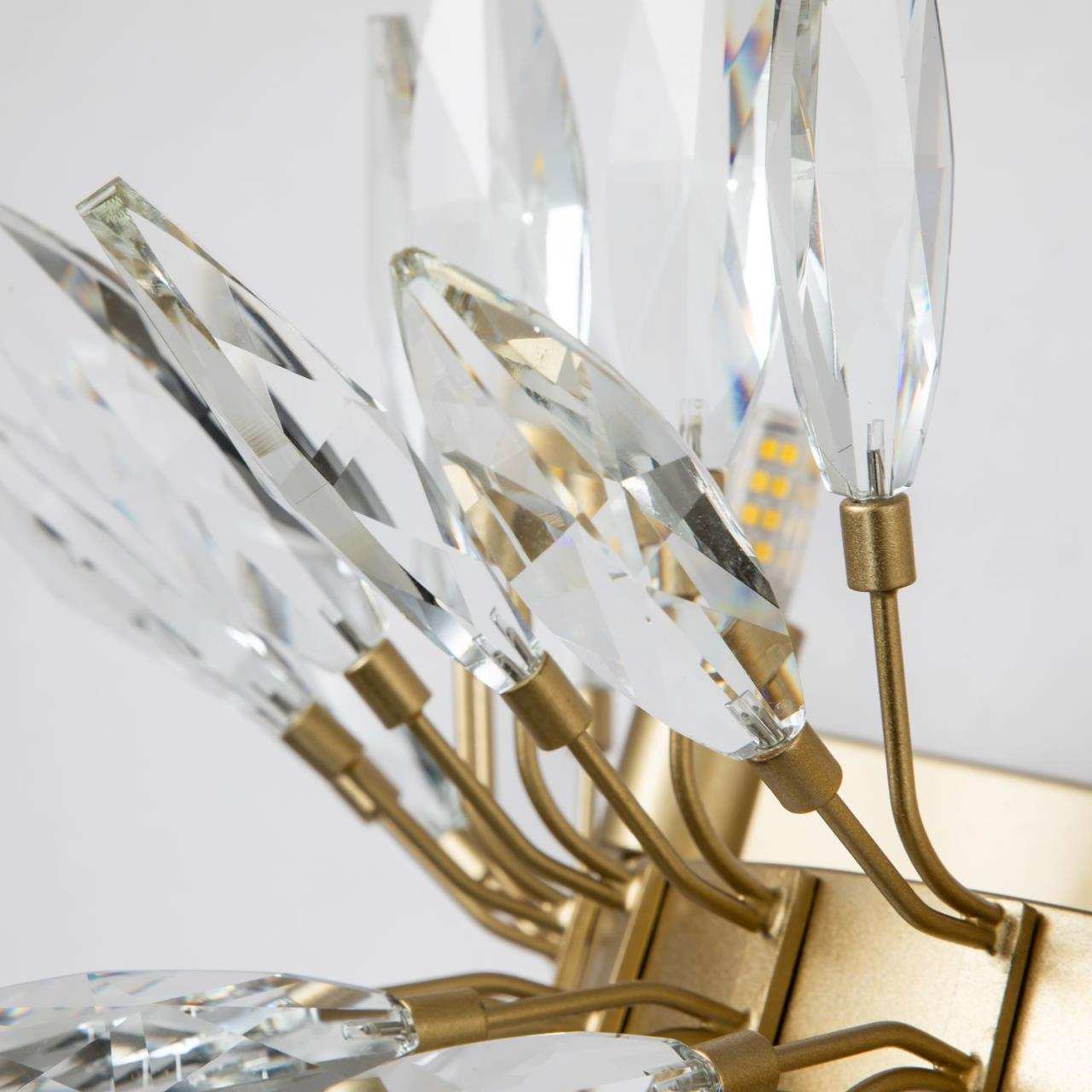 Каркас цвета золота, источники света направлены вверх и вниз, декоративные элементы из прозрачного хрусталя миндалевидной формы, лампу g9 можно менять