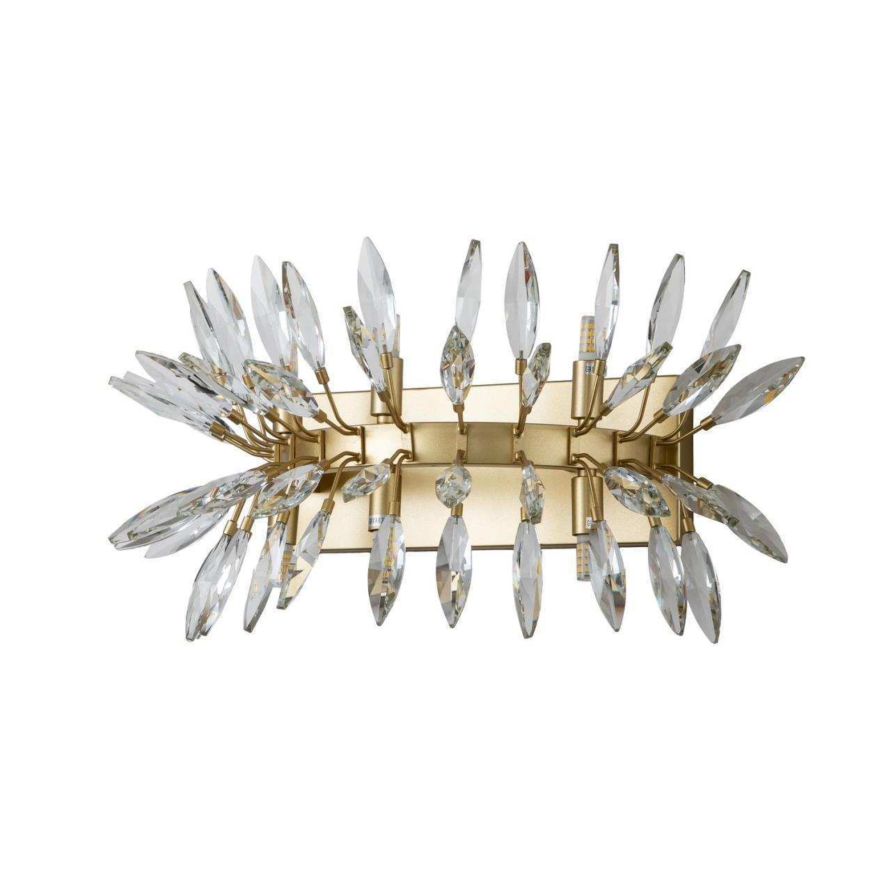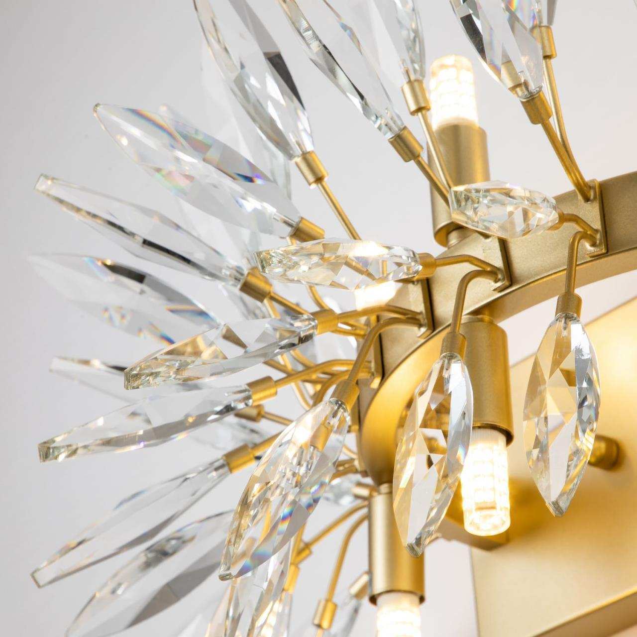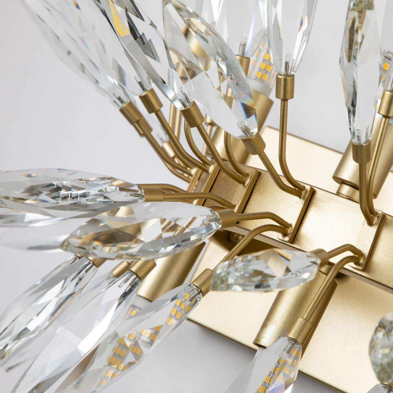 Каркас цвета золота, источники света направлены вверх и вниз, декоративные элементы из прозрачного хрусталя миндалевидной формы, лампу g9 можно менять
