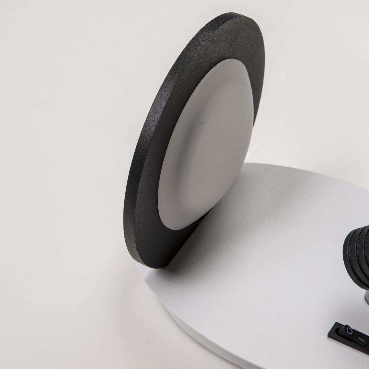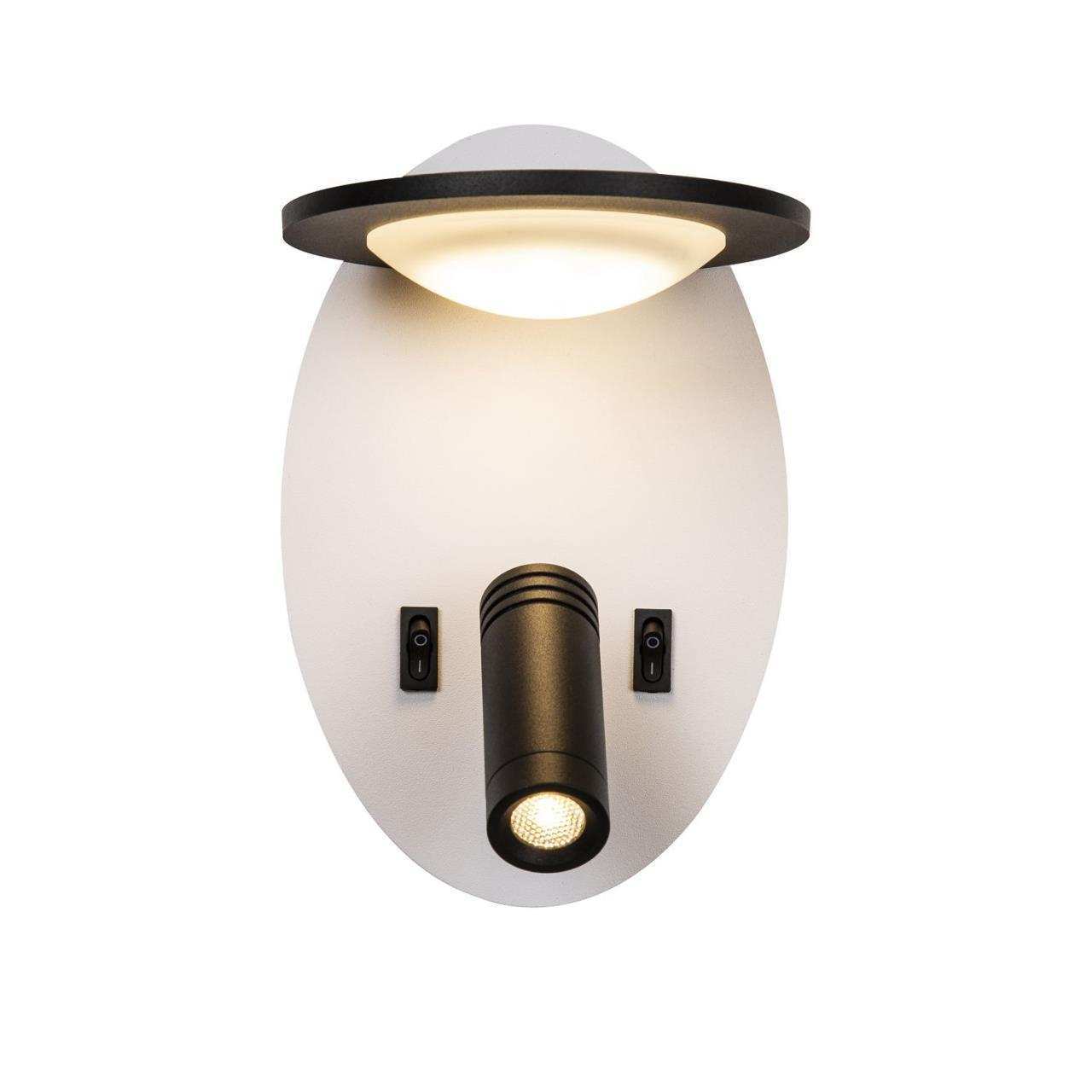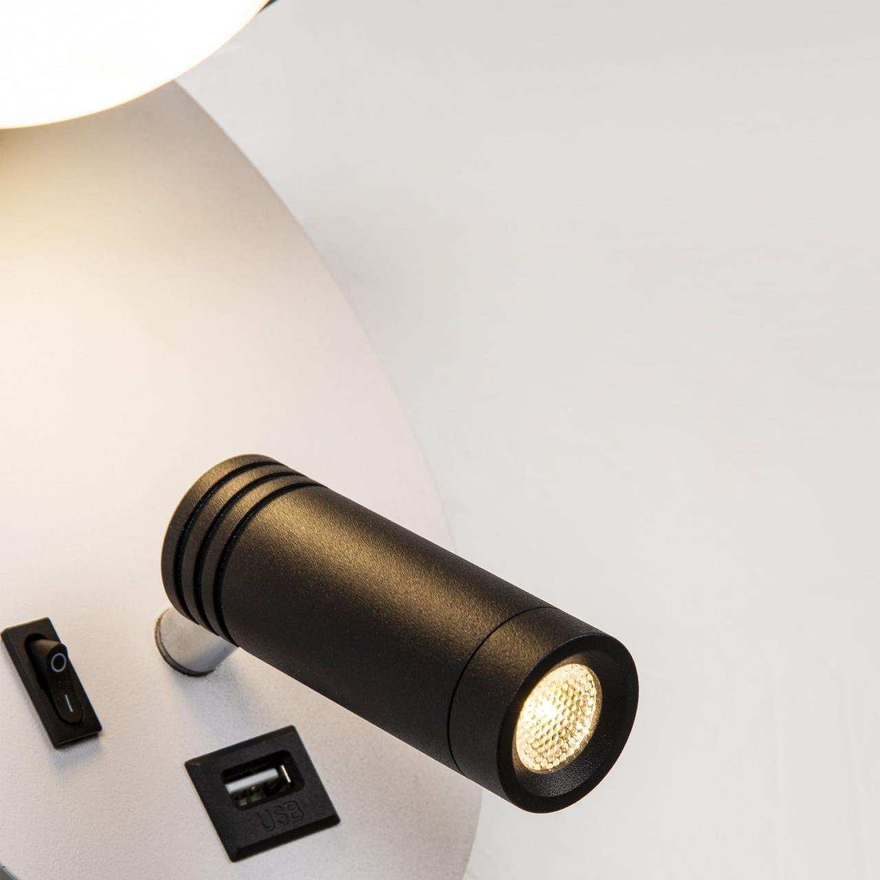 Каркас сочетает белый и черный цвета, плафон из белого акрила, поворотный спот, два выключателя, usb-порт