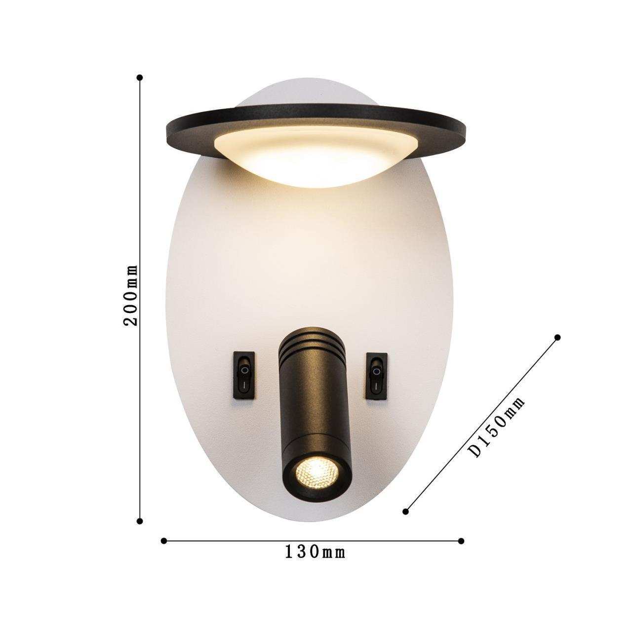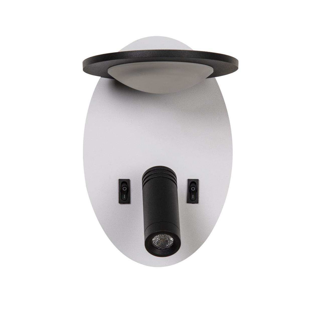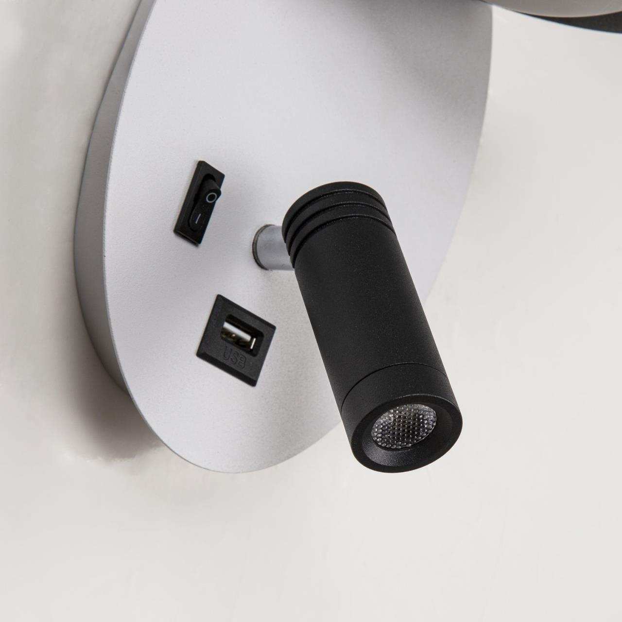 Каркас сочетает белый и черный цвета, плафон из белого акрила, поворотный спот, два выключателя, usb-порт