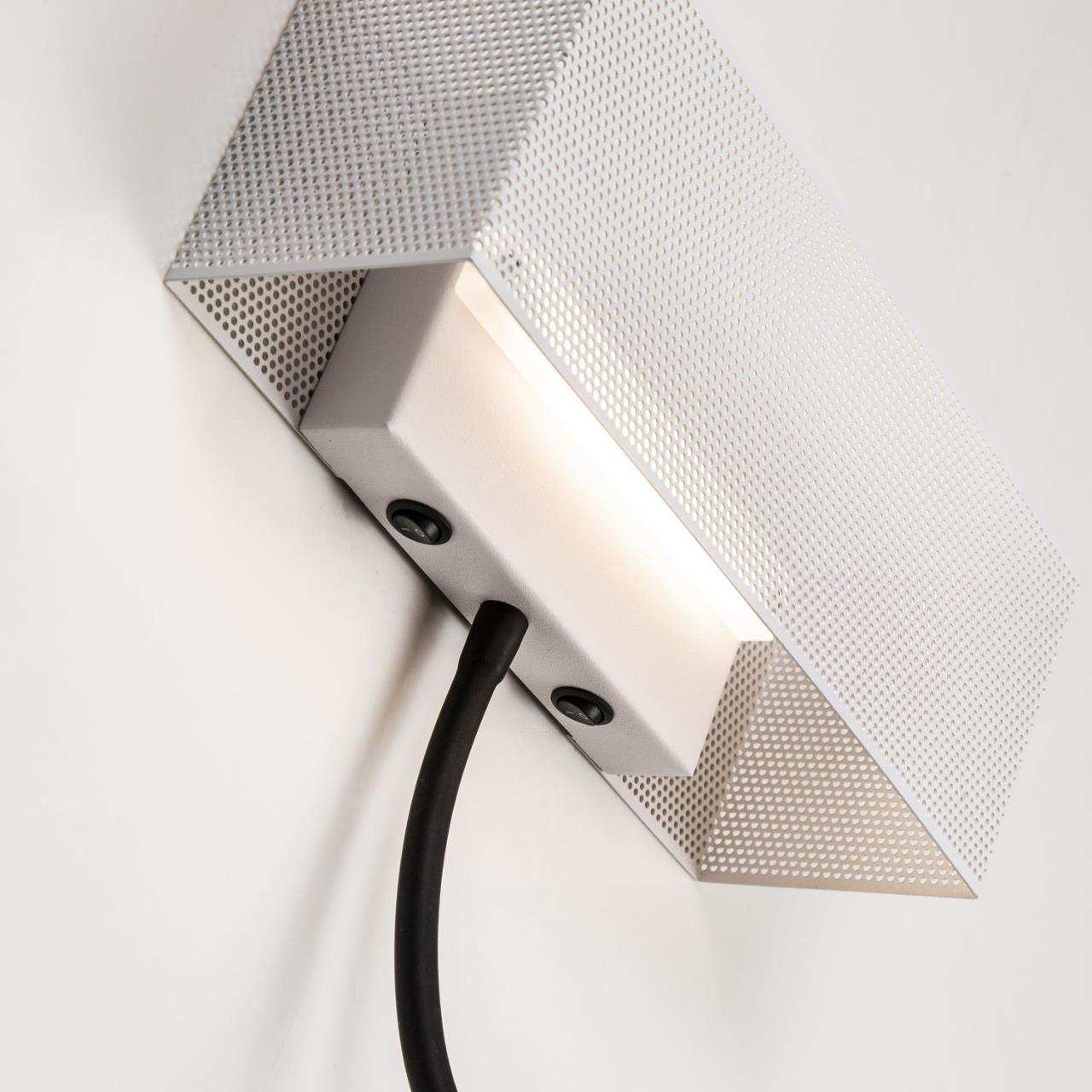 Каркас белого цвета, лента-led, прямоугольный металлический плафон с перфорацией, поворотный спот led черного цвета, два выключателя