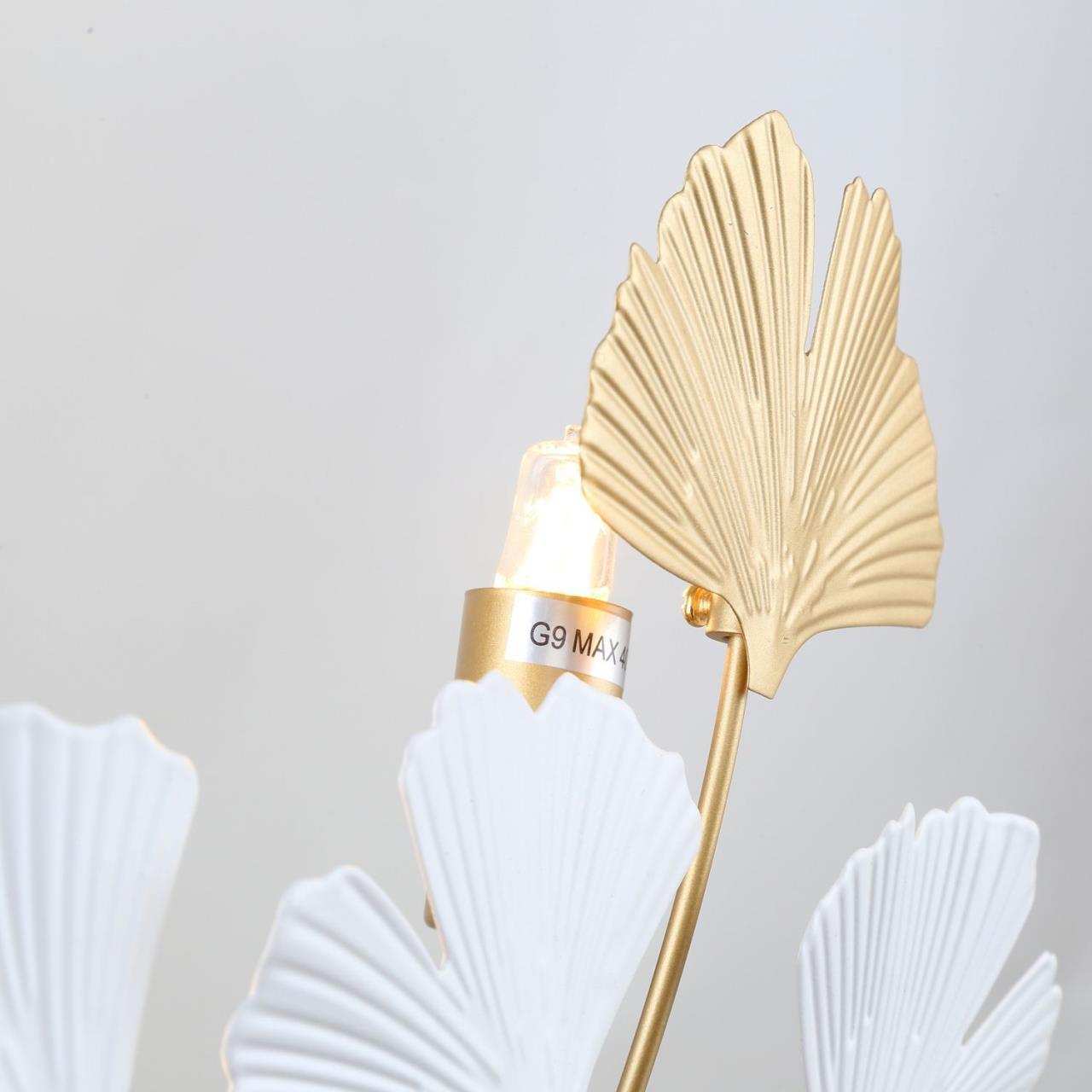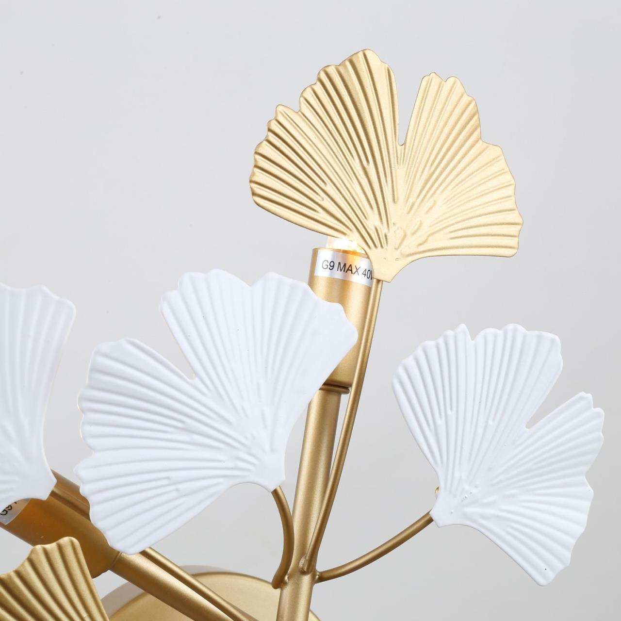 Каркас цвета окрашенное золото, декор в виде листьев гинкоа в белом и золотом цвете, лампы можно менять