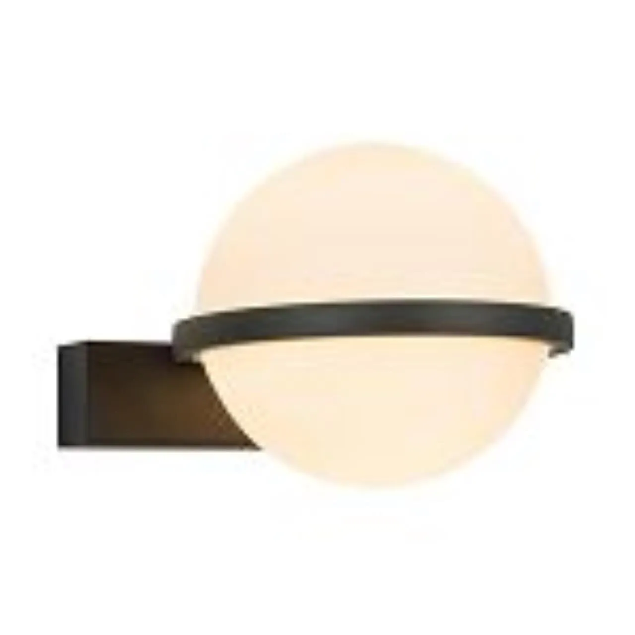 Плафон в форме сферы с черным каркасом, состоящей из двух половинок белого стекла с модулем LED внутри, закреплен на черных металлических кольцах.
