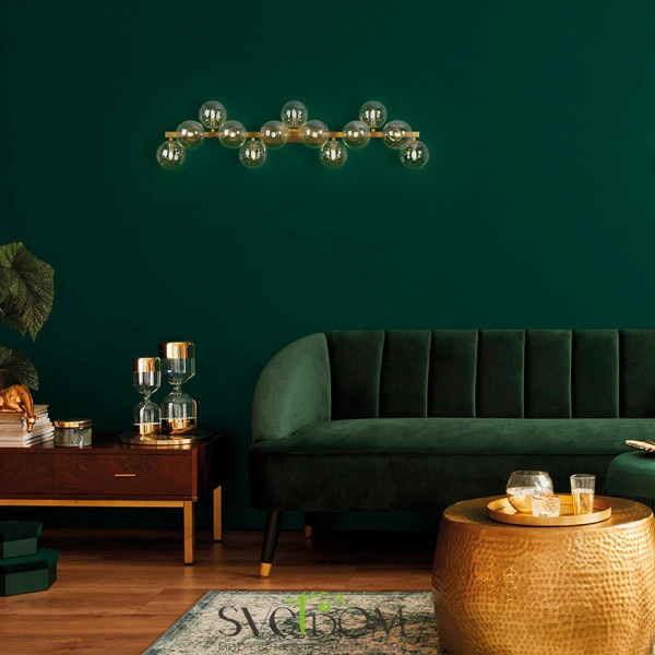 Масштабные скульптурные композиции, образованные многочисленными шарами из выдувного стекла, формируют неповторимый облик светильников серии. на полированных металлических ветвях установлены тонированные плафоны, которые мягко рассеивают и приглушают свет ламп. модели серии представлены в трех цветах: золото, хром и латунь. высота подвесных светильников регулируется длиной троса. серия представлена потолочными, подвесными светильниками, и бра.