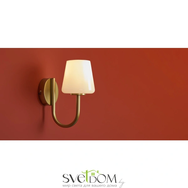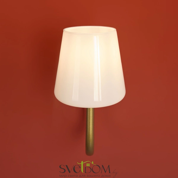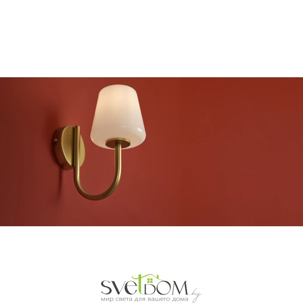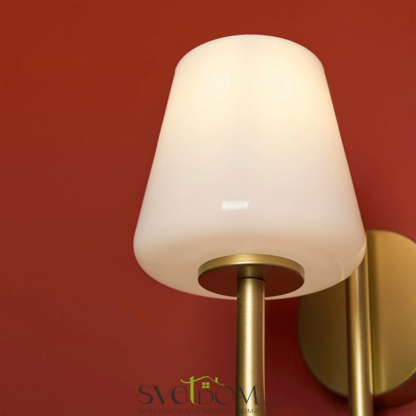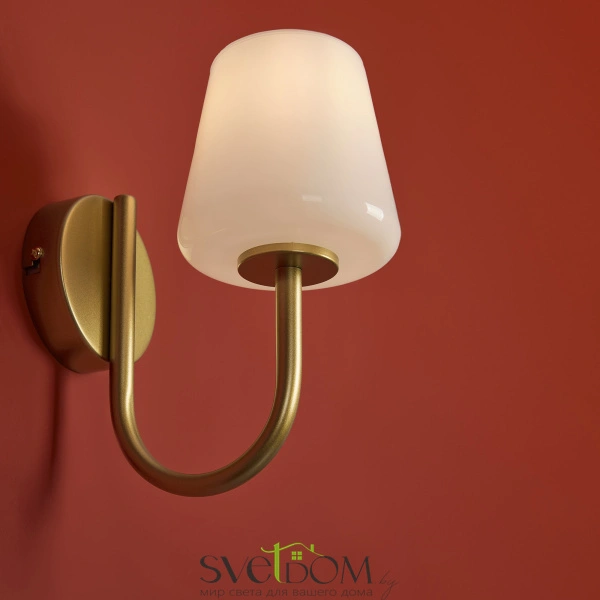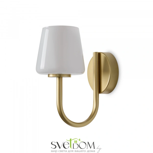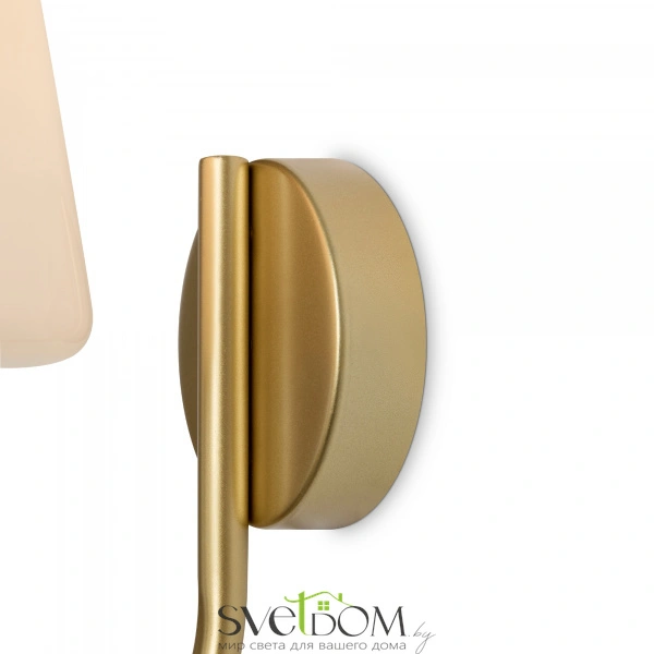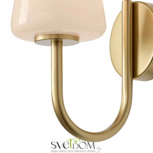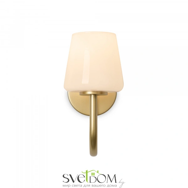 Материал арматуры — металл, цвет — матовое золото. Подвесной  и настенный светильники с цоколем E14. Плафоны выполнены из белого глянцевого стекла, которые мягко рассеивают свет. Минималистичная классика подходит для современных и традиционных интерьеров.