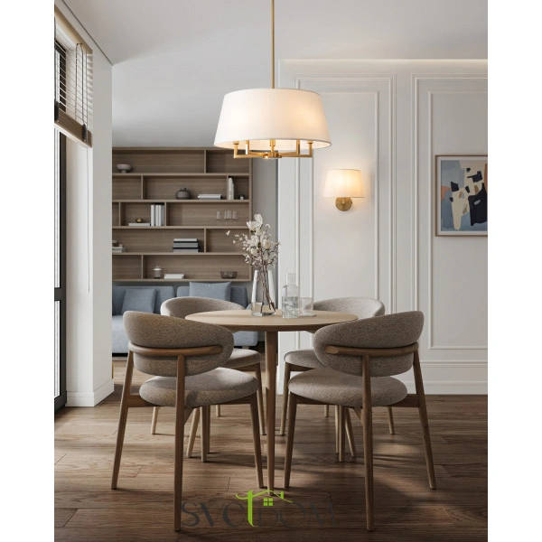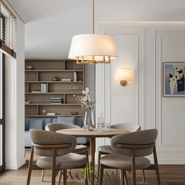 Материал арматуры — металл, цвет — латунь или никель. Потолочные и настенные светильники с цоколем E14. Металлическая арматура строгой геометричной формы. Светлые абажуры из ткани создают мягкий рассеивающий свет. Подходит для оформления классических интерьеров.