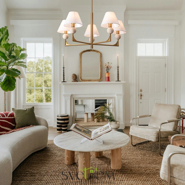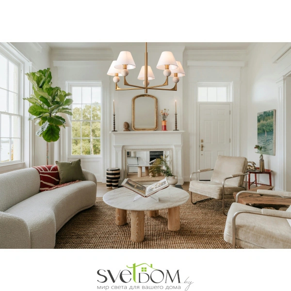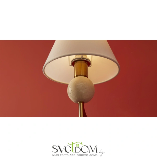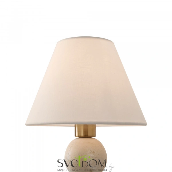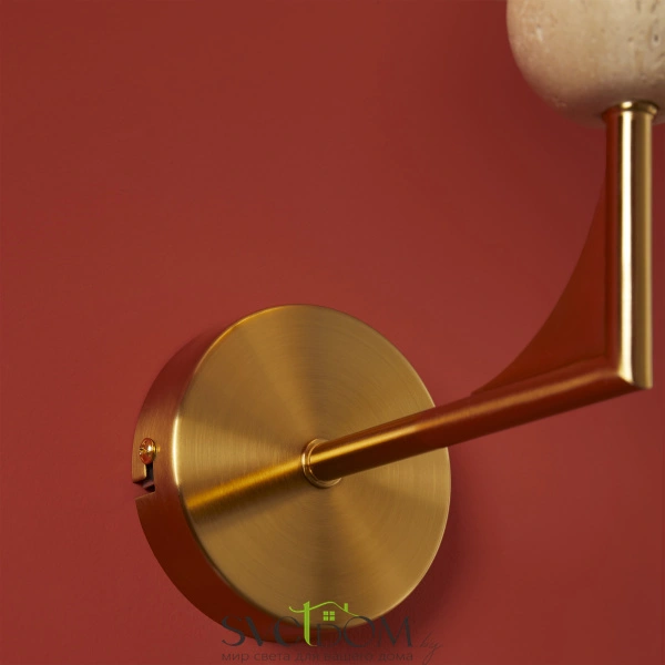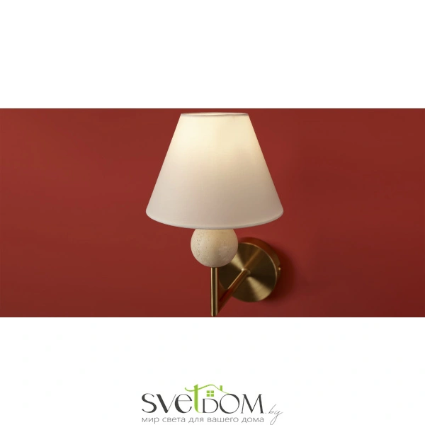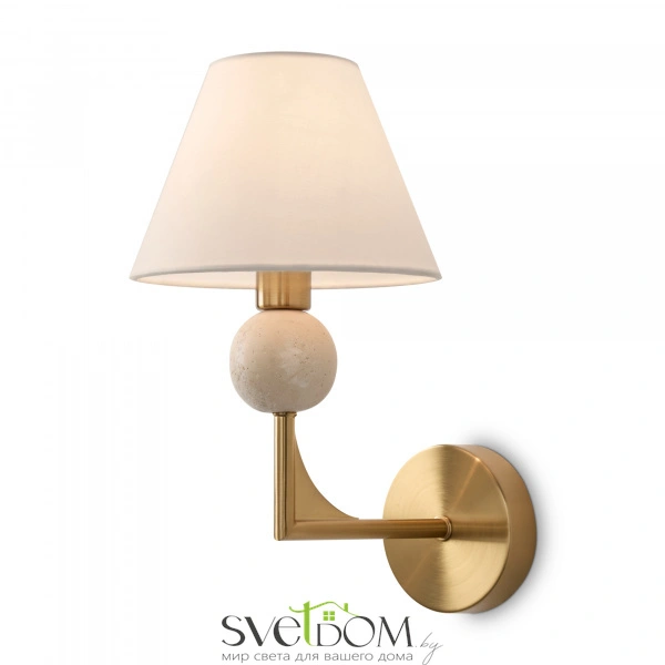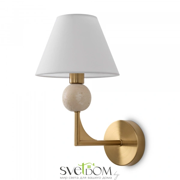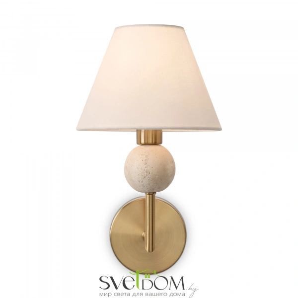 Материал арматуры — металл. Цвет металла — латунь. Абажуры выполнены из белой ткани, которые мягко рассеивают свет. Потолочные и настенные светильники с цоколем E14. Декоративные элементы в форме шара на плафоне выполнены из травертина. Металлическая форма арматуры строгой геометрической формы с пластинами из латуни. Подходит для оформления элегантных классических пространств.