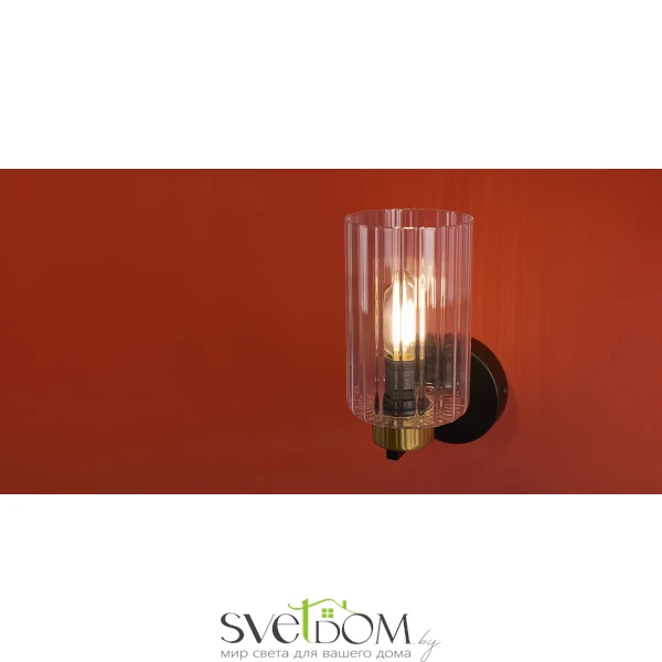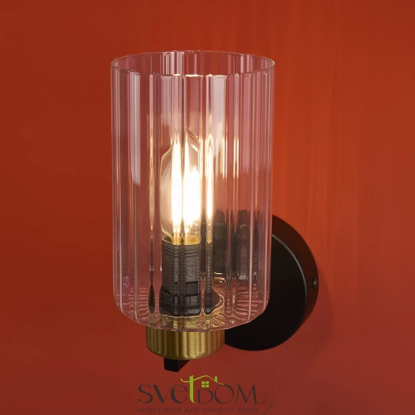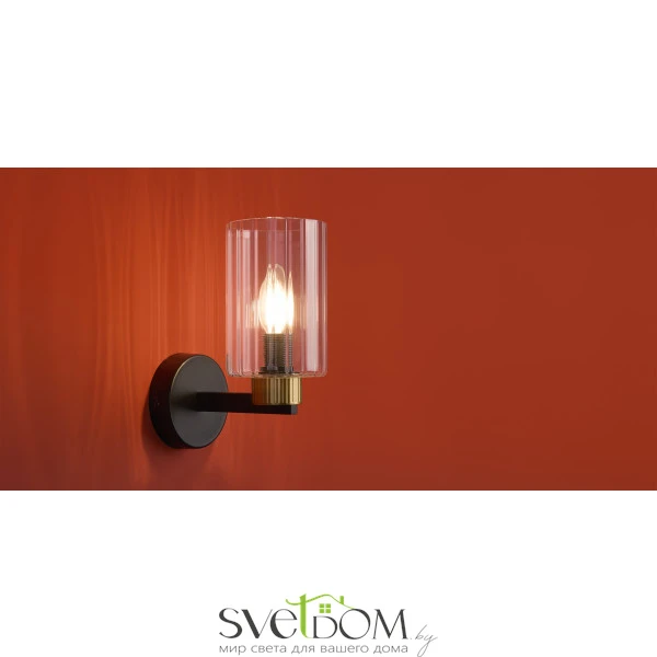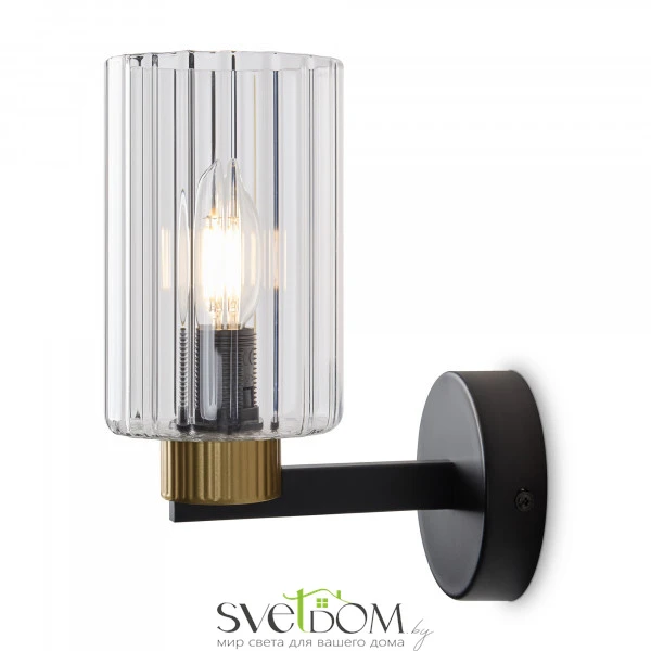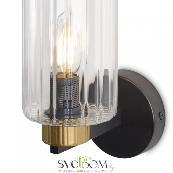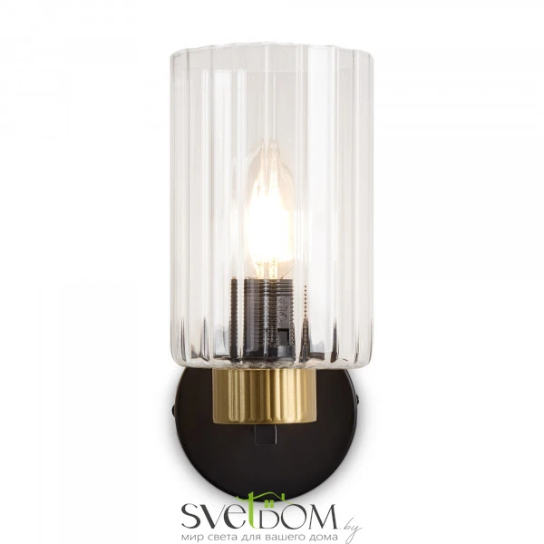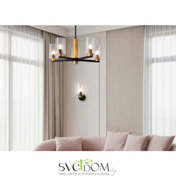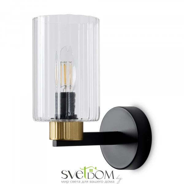 Металлическая арматура чёрного матового цвета с латунными вставками. Прозрачные цилиндрические стеклянные абажуры. Лампы E14 (не включены). Трендовое сочетание для современных интерьеров.