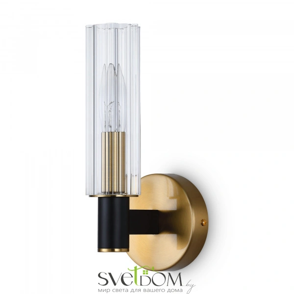 Арматура из металла сочетает два оттенка: черный и латунь. Плафоны цилиндрической формы выполнены из рельефного прозрачного стекла. Актуальная геометрия с настроением американской классики. Источник света – лампа с цоколем E14.