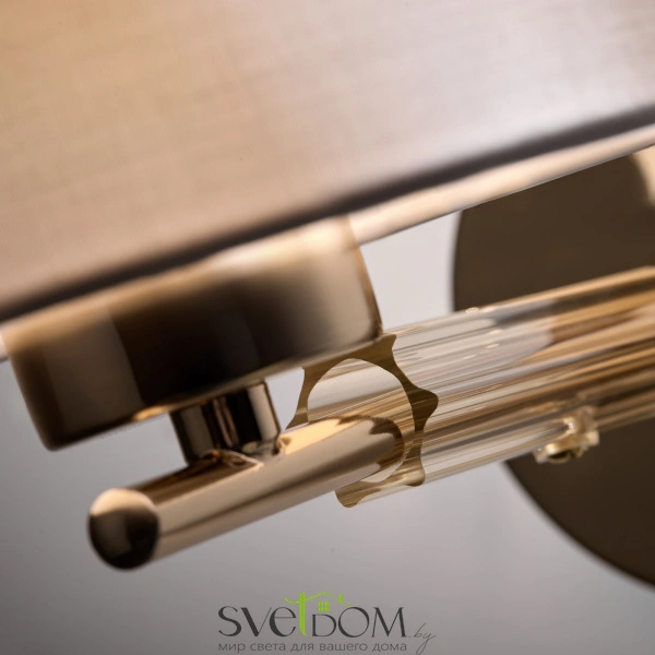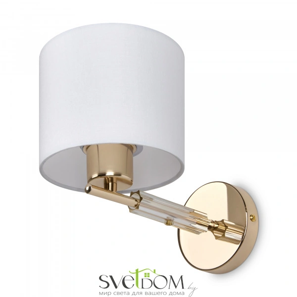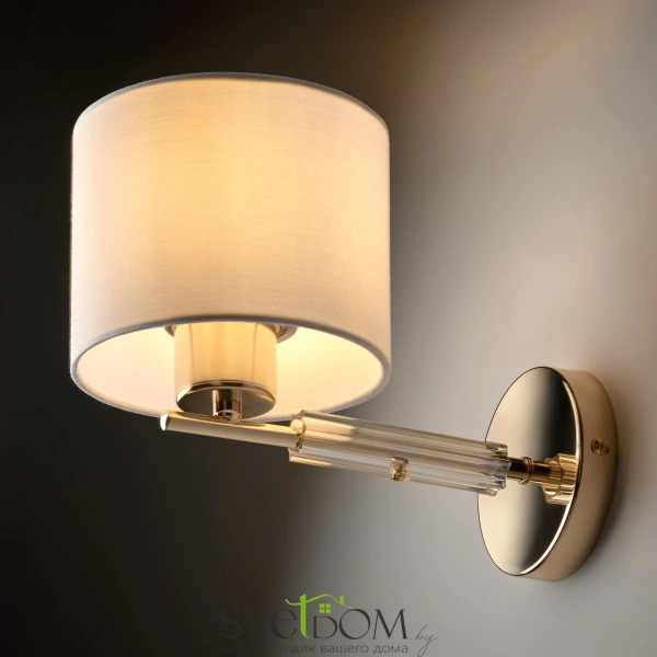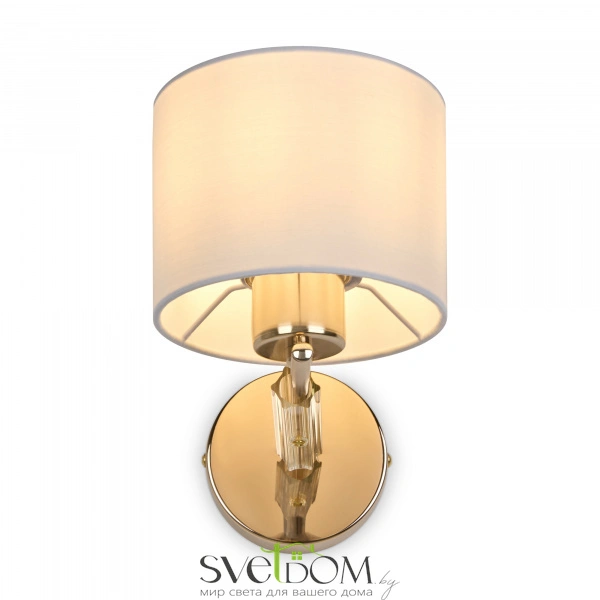 Арматура – металл + стекло, цвет - золото. Универсальные тканевые абажуры в белом цвете. Декоративные элементы из прозрачного рельефного стекла. Источник света - лампа с цоколем Е27.
