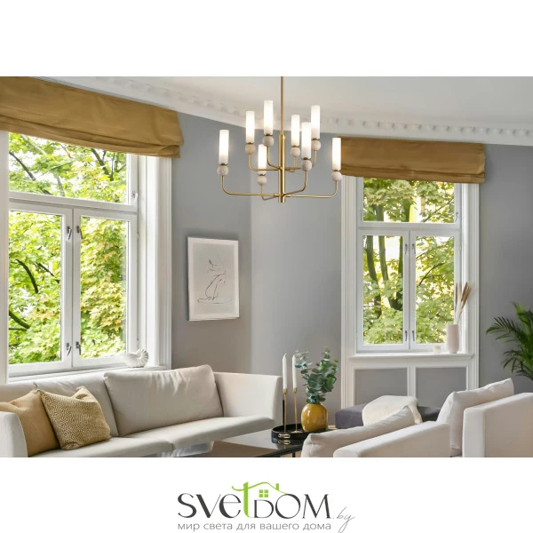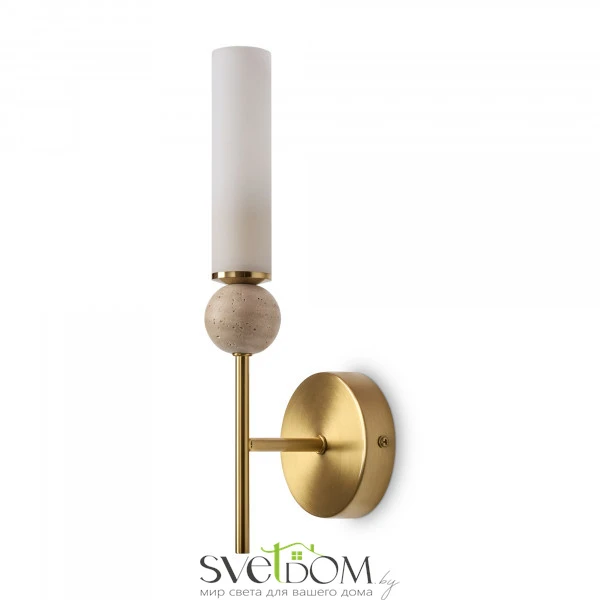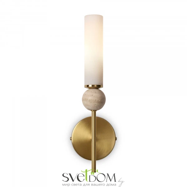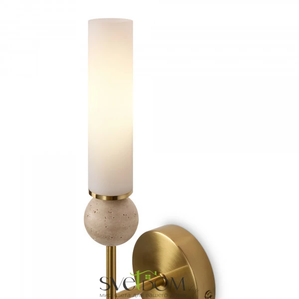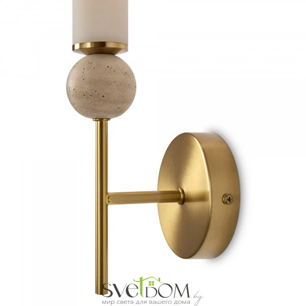 Натуральный травертин и стеклянные плафоны. Металл (латунь, черный). Матовые белые абажуры. LED 3000K (E14/G9, не в комплекте). Сенсорное управление. Подвесные светильники с декоративным элментом травертина в виде шара.