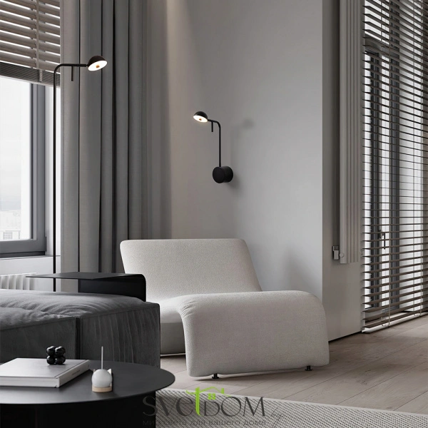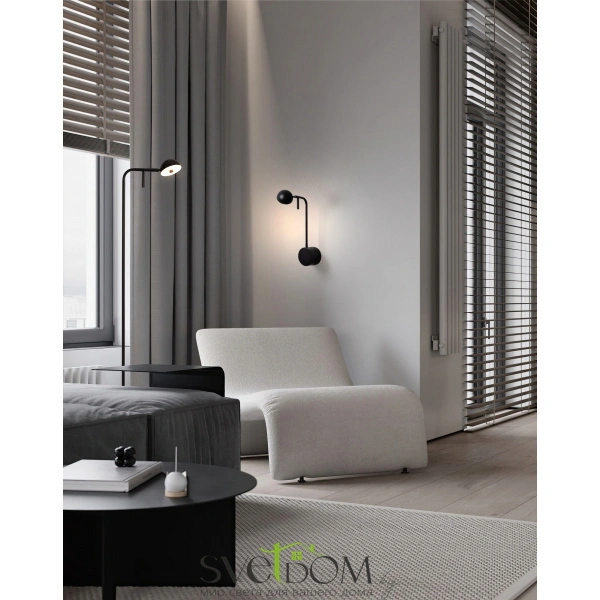 Материал арматуры — металл, цвет — черный. Напольный торшер и настенные светильники оснащены LED-источниками света с цветовой температурой 2700К. Полусферические поворотные мини плафоны с LED освещением подчеркивают монохромную концепцию дизайна. Подходит для создания минималистичных и лофт интерьеров.