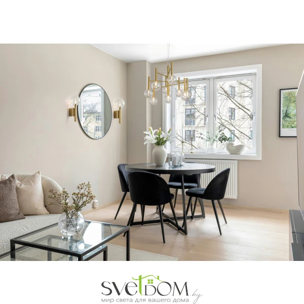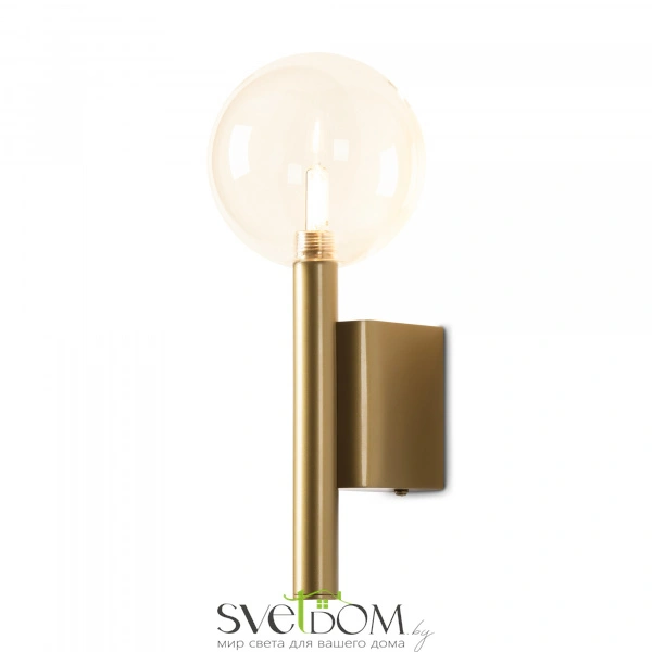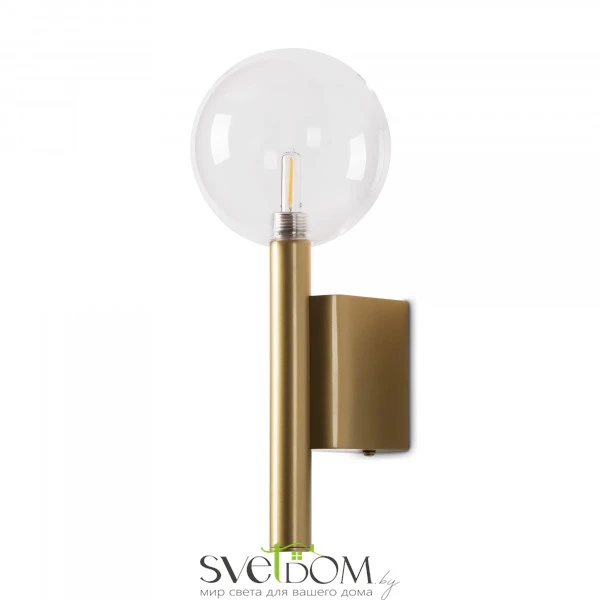 Арматура -  металл в цвете матовое золото. Светильники с прозрачным дутым стеклом. LED источник света (2700K). Круглые стеклянные абажуры создают тёплый свет. У настенного светильника 2 источника света.