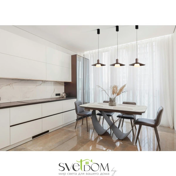Арматура - металл. LED источник света (4000K). Подвесные светильники и бра настенные в золотом матовом оттенке плафонов и арматуры. Трансформируемые плафоны создают эффект аутдора.