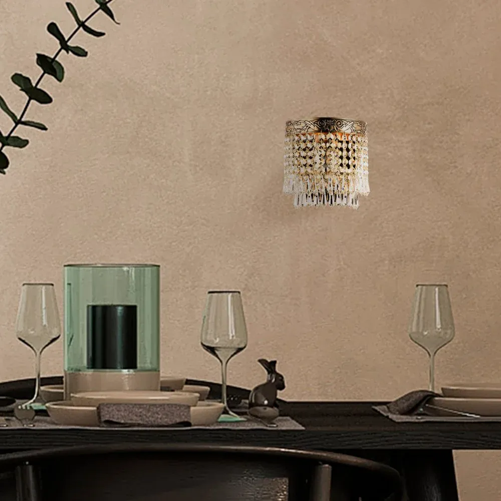 Арматура из металла, цвет – античное золото. Декор металлических элементов – инкрустированный цветочный орнамент. Многоярусные хрустальные подвески скрывают лампы. Часть моделей имеет открытые источники света в виде свечей.