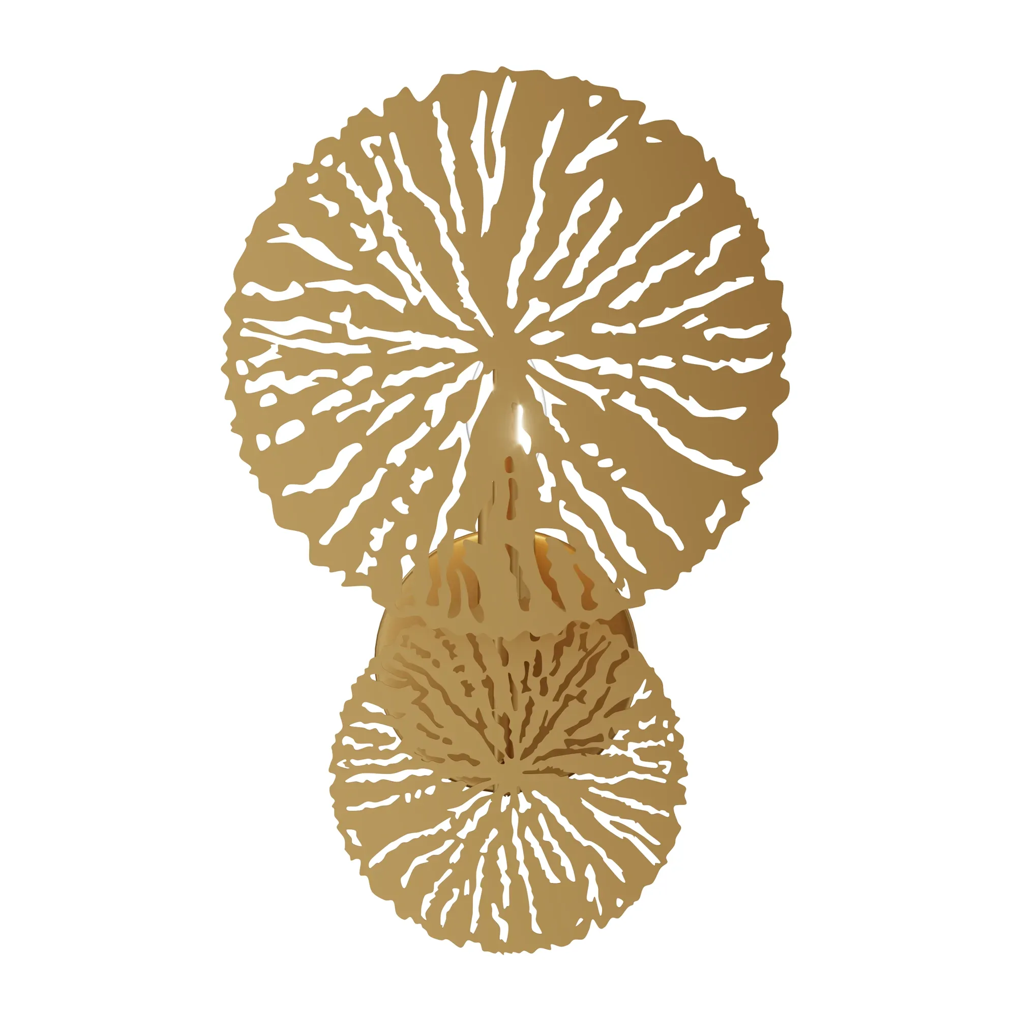 Арматура из металла, цвет — матовая латунь. Декор — ажурные диски в тон арматуре. Эффектный световой рисунок. Трендовые флористические мотивы в дизайне. Светильники серии легко комбинировать, создавая композиции. Источник света – лампа с цоколем Е14.