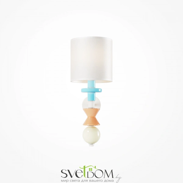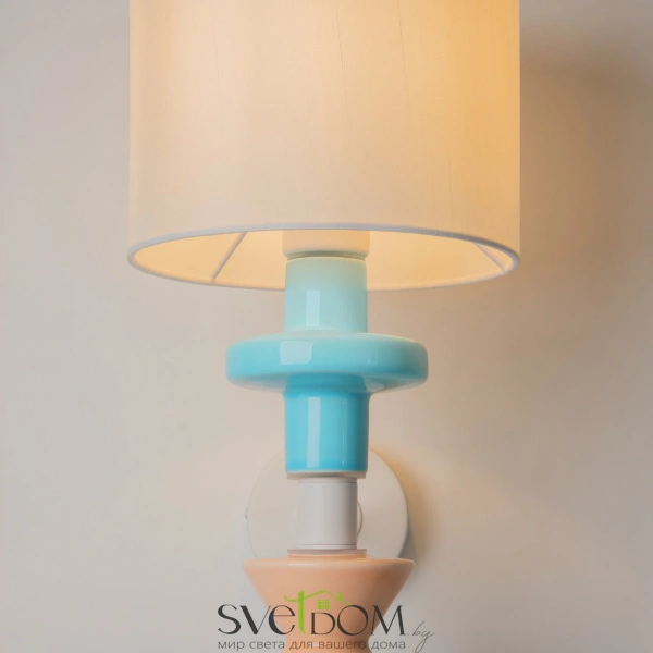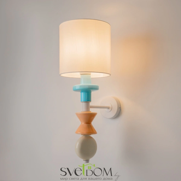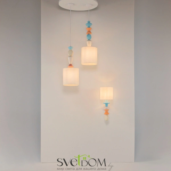 Арматура из металла, цвет - белый. Абажур выполнен из натуральной ткани, цветные декоративные элементы в пастельных тонах — из керамики. Белый абажур имеет классическую цилиндрическую форму, ткань дает мягкий рассеянный свет. Светильники комплектуются сменными лампами с цоколем Е27 (не входят в комплект). Провод подвесного светильника можно регулировать по длине. Декор напоминает стилистику  крафтового искусства