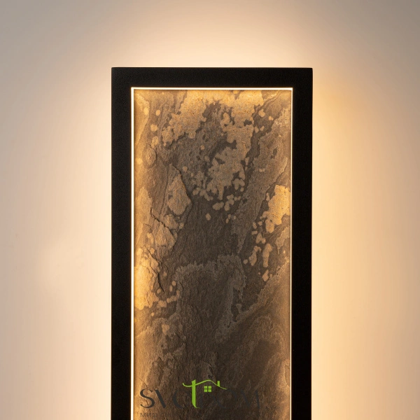 Сочетание первозданных материалов и современных технологий освещения. Корпус из натурального камня серого цвета с естественным рисунком и прожилками, подсвеченный LED-источником света с температурой 3000К. Цвет арматуры — черный. Материал арматуры — металл. Светодиодный источник света. Два размера потолочных и настенных моделей. Игра света и тени подчеркивает природный рельеф камня. Высокий индекс цветопередачи >90 Ra для естественного освещения.