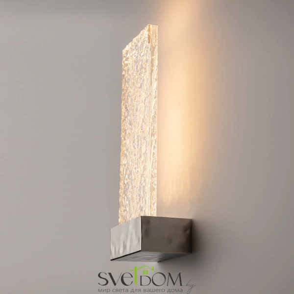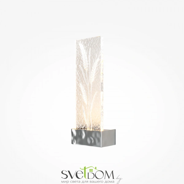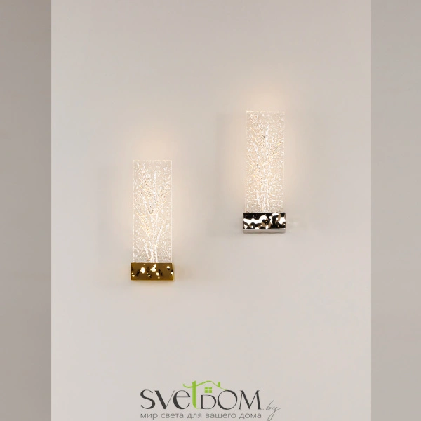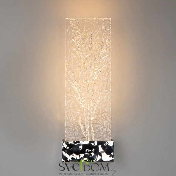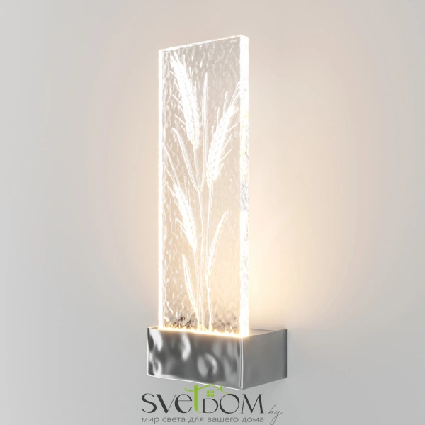 Цвет арматуры — хром, золото. Материал арматуры — нержавеющая сталь. Цветовая температура 3000К. Оригинальный дизайн бра с флористическим рисунком и волнистой поверхностью. LED-источник света. Сочетание рассеянного и переотраженного света. Скрытые монтажные крепления для эстетичного вида. Стеклянный плафон с орнаментом, гармонирующим с основанием. Модели, сочетающие эко-мотивы и статусный дизайн.