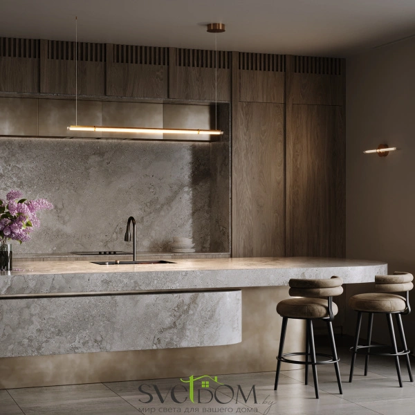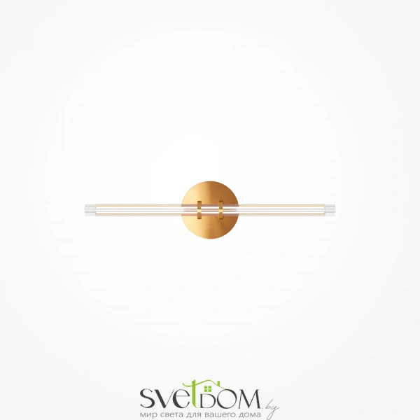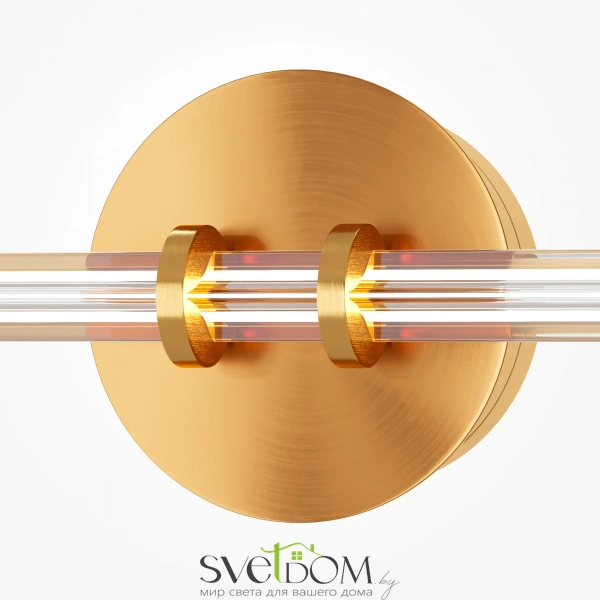 Металлическая арматура латунного цвета дополнена сатинированным финишным покрытием. Тонкие плафоны, изготовленные из рифленого стекла. Два варианта длины: 1200 и 1500 мм. Трехметровый провод можно регулировать для установки в помещениях с высокими потолками. Цветовая температура LED-источника света — 3000К, угол рассеивания — 120 градусов.