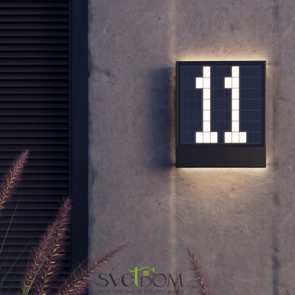 Материал арматуры — алюминий и стекло. Цвет — черный.  Два направления света — основное с номером дома и декоративная подсветка с направлением вниз. LED-источник света. Цветовая температура 3000К. Защита корпуса IP65 позволяет использовать в экстерьере и помещениях с повышенной. Мощность 10Вт. Настенный светильник для акцентной и декоративной подсветки входной зоны.
