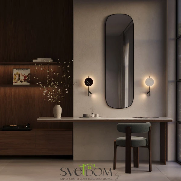 Сочетание натуральных материалов и технологий. Арматура: металл черный. Декоративный диск: натуральное дерево или мрамор (черный/белый) с уникальным рисунком. Два LED-источника 3000K: скрытая подсветка с матовым рассеивателем для отраженного света и поворотный спот для направленного освещения. Сенсорное управление на корпусе с раздельным включением источников и функцией диммирования. Настенные светильники для современного интерьера. Создает как общее заливающее освещение, так и точечную подсветку.