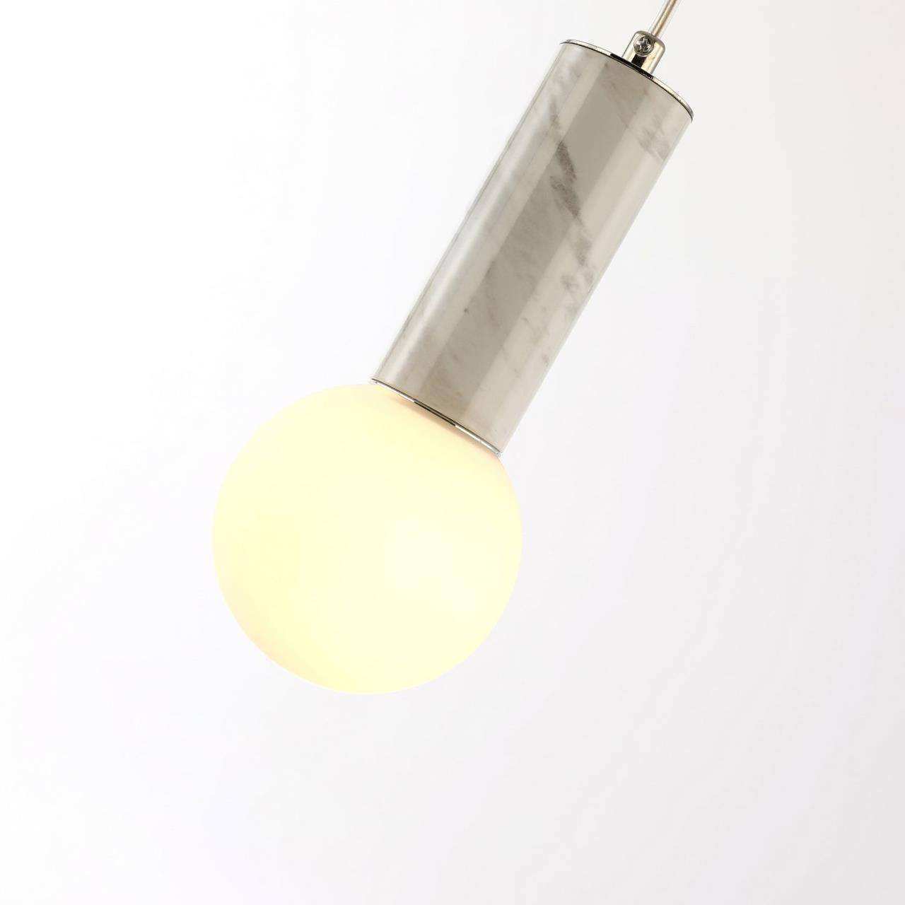Подвес цилиндрической форм, каркас цвета хром, отделка - имитация белого мрамора, выдувной плафон белого цвета