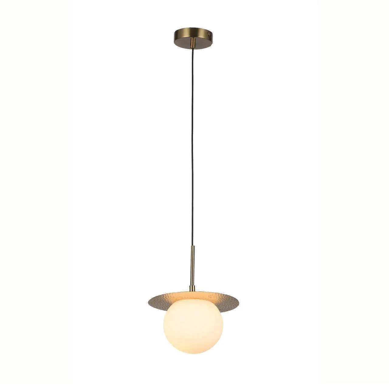 Каркас цвета меди, плафон из белого стекла, декоративный элемент в виде металлического узорного блюдца