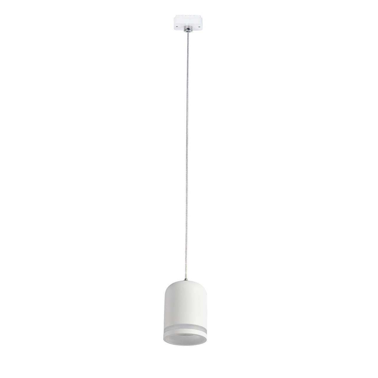 Подвесной светильник на шинопровод белого цвета с закругленным конусообразным плафоном, в который встроено декоративное акриловое кольцо