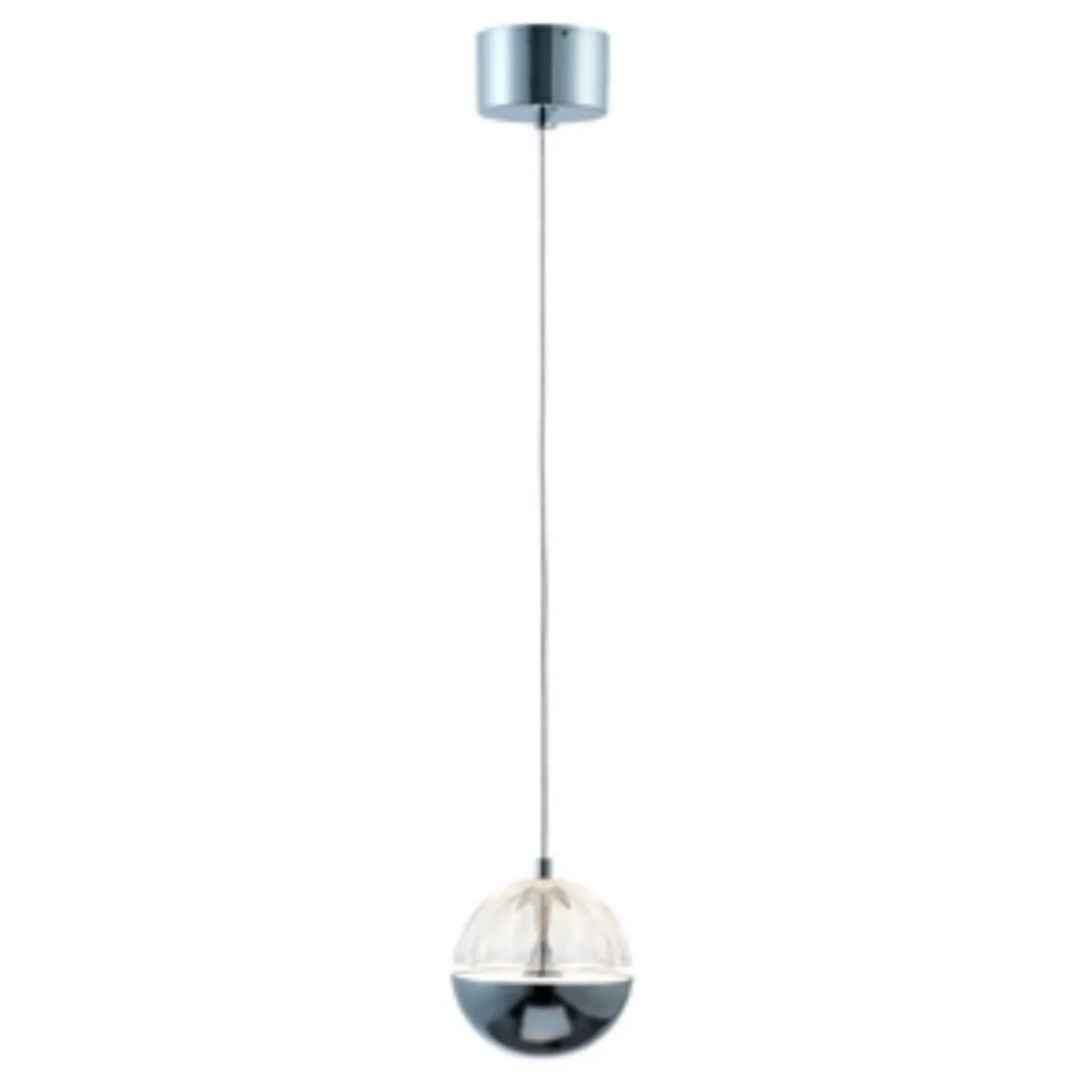 Подвес в цвете хром и прозрачное стекло, плафон с рельефной полусферой, металлической полусферой внутри которой расположен модуль LED. Между полусфера