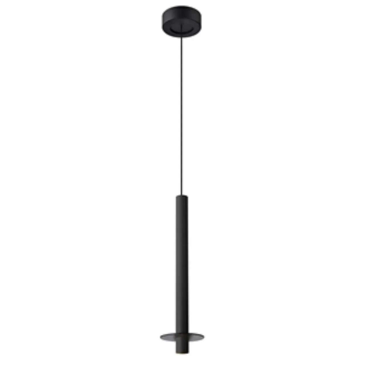 Подвес с черным каркасом, плафон из алюминия в форме тонкого удлиненного цилиндра в черном цвете, в нижней части подвеса расположен светодиодный источ