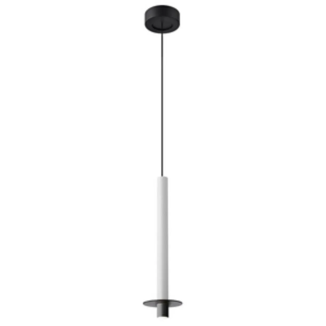 Подвес с черным каркасом, плафон из алюминия в форме тонкого удлиненного цилиндра в белом цвете, в нижней части подвеса расположен светодиодный источн