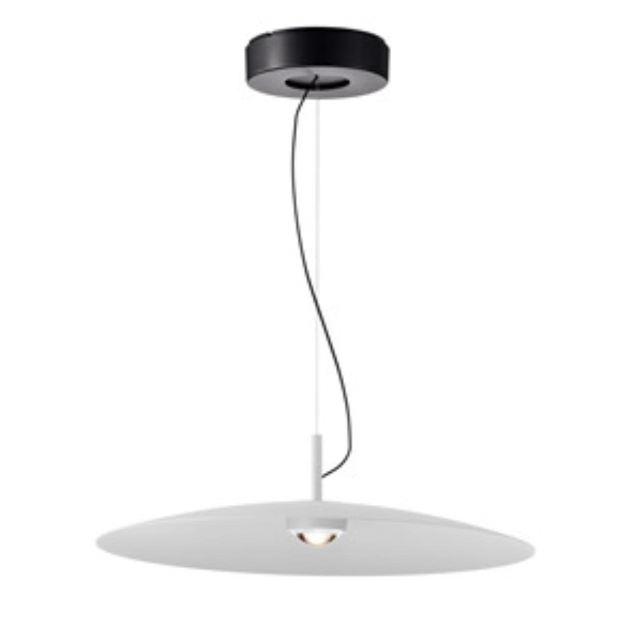 Подвес с черным каркасом, плафон в белом цвете с практически плоской формой купола, диаметром 45 см, алюминиевый плафон имеет лаконичный силуэт и осна