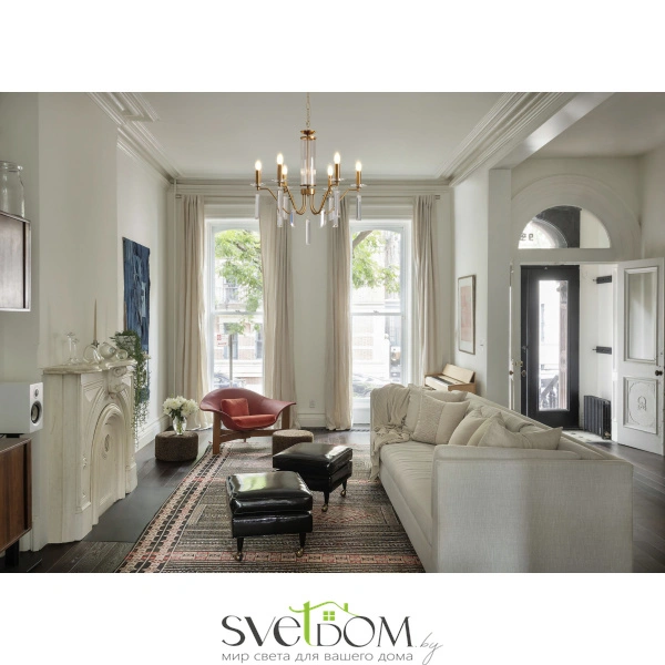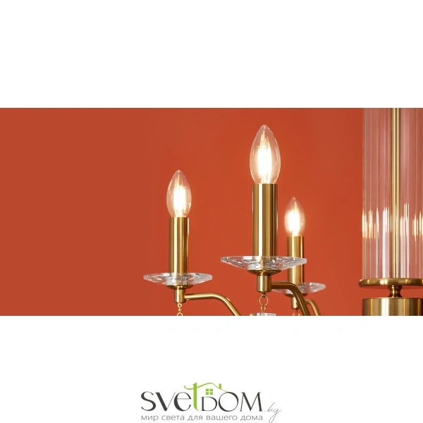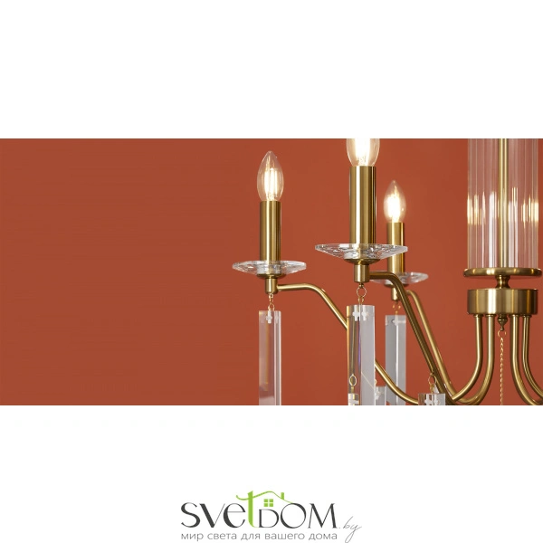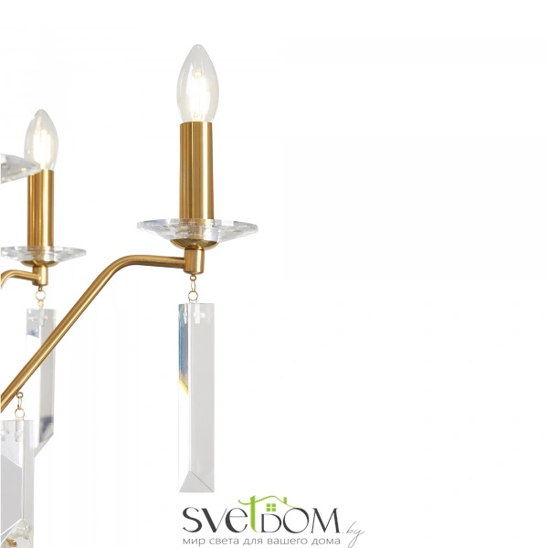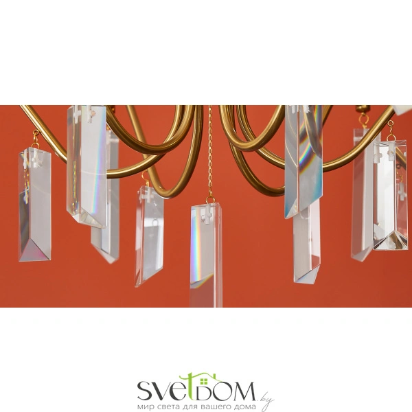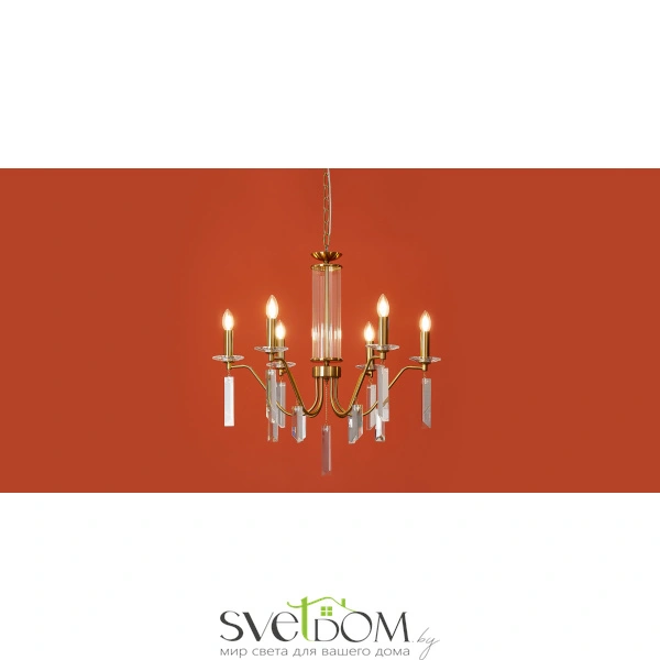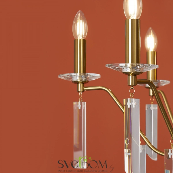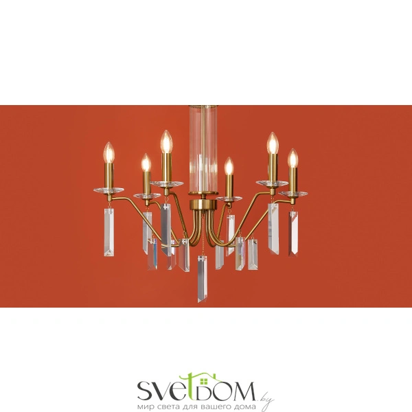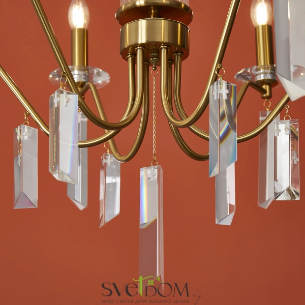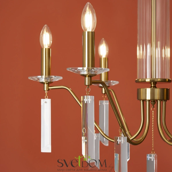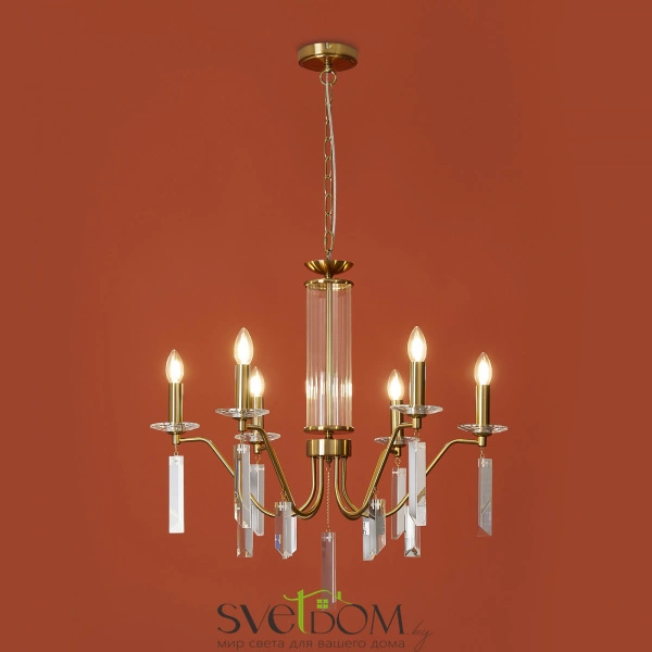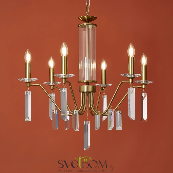 Материал арматуры — металл, цвет — никель или латунь. Подвесные светильники с цоколем E14. Доступны с пятью или шестью источниками света. Грани хрустальных подвесов создают эффект перелива радуги.   Центральный декор из стеклянных трубок. Подходит для классических интерьеров.